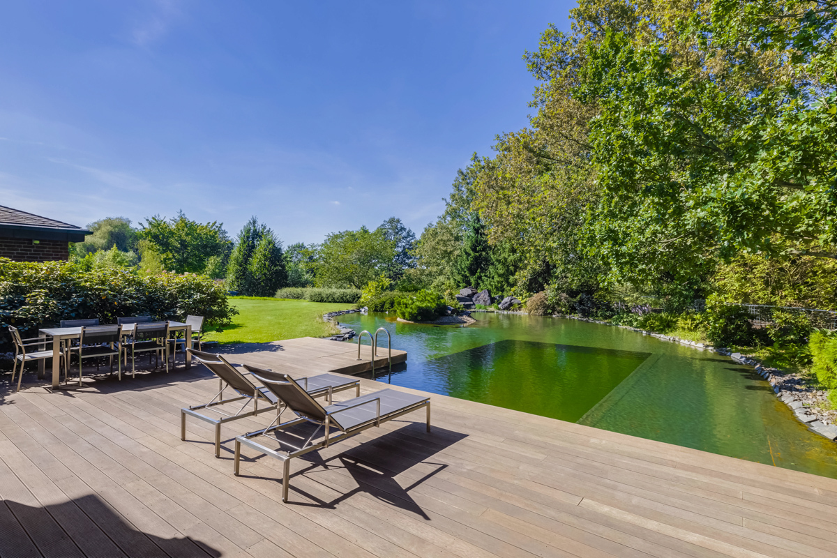 Na interiér navazuje venkovní terasa s posezením a výhledem na koupací jezírko s bezchlorovým čisticím systémem. K domu náleží také vzrostlá a udržovaná zahrada (2 900 m²) s automatickým zavlažováním ze studny s čerpadlem. Zahrada nabízí množství zákoutí k relaxaci a kombinaci okrasných květin, dřevin a bylinek.