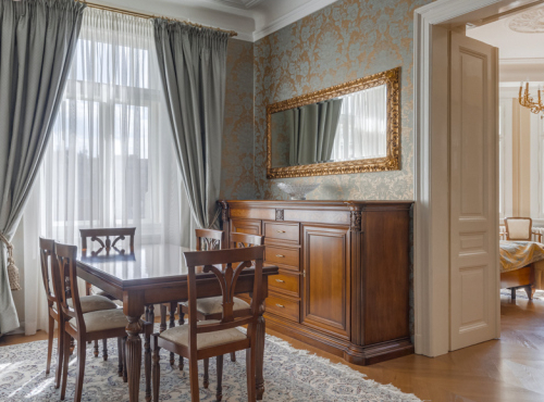 Apartmán uchvátí svou elegancí a historickými prvky s jedinečným geniem loci. Kromě toho je velmi slunný a prosvětlený díky množství špaletových oken, které byly nově zrestaurovány a odhlučněny. Bytu dominuje reprezentativní obývací pokoj s historickými stropními štuky a odpočinkovým prostorem s pohovkou a jídelní částí. Dále v bytě nalezneme prostornou vstupní halu, koupelnu s vanou a oddělenou toaletou, dvě soukromé ložnice a plně vybavenou kuchyň.