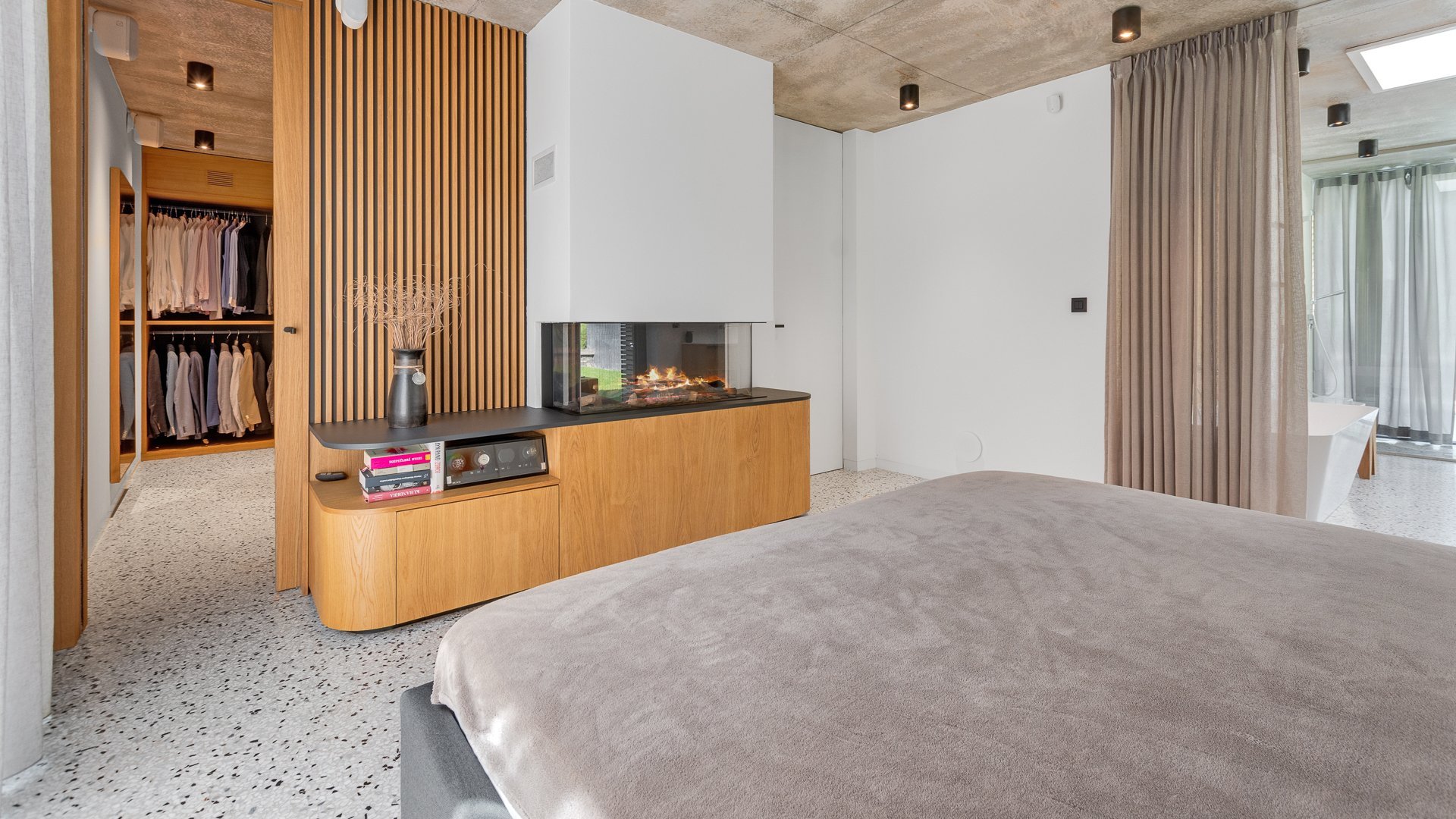 Po vstupu do odděleného soukromého prostoru majitelů procházíme kolem knihovny s příjemným výhledem do atria s pečlivě udržovanou výsadbou. Noční část je zastoupena hlavní ložnicí s plynovým krbem, která má vlastní koupelnu s přímým vstupem na terasu a šatnu s dostatkem úložného prostoru, a dvěma dětskými pokoji propojenými společnou šatnou a koupelnou se sprchou. V této části domu je majitelům k dispozici také prádelna.