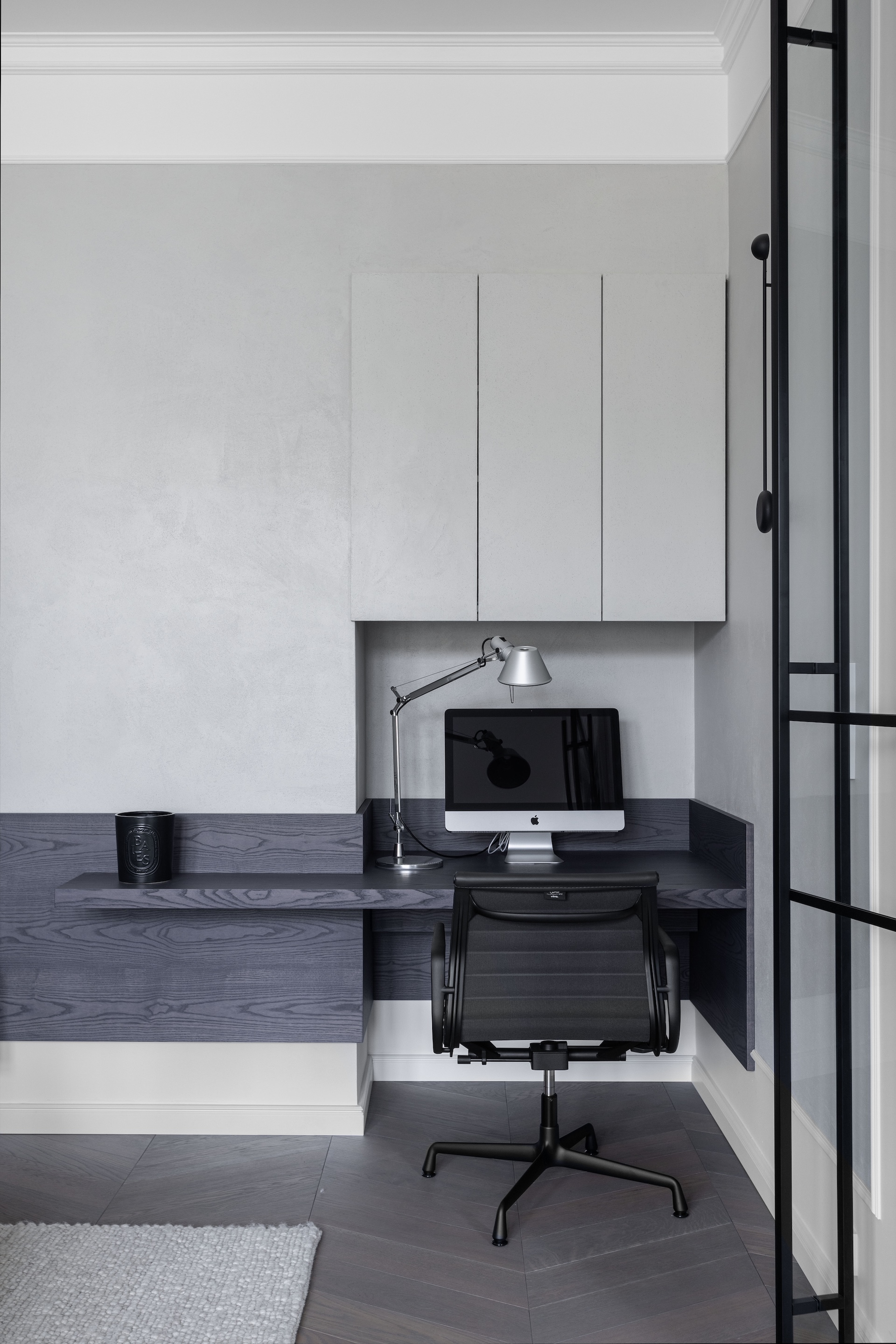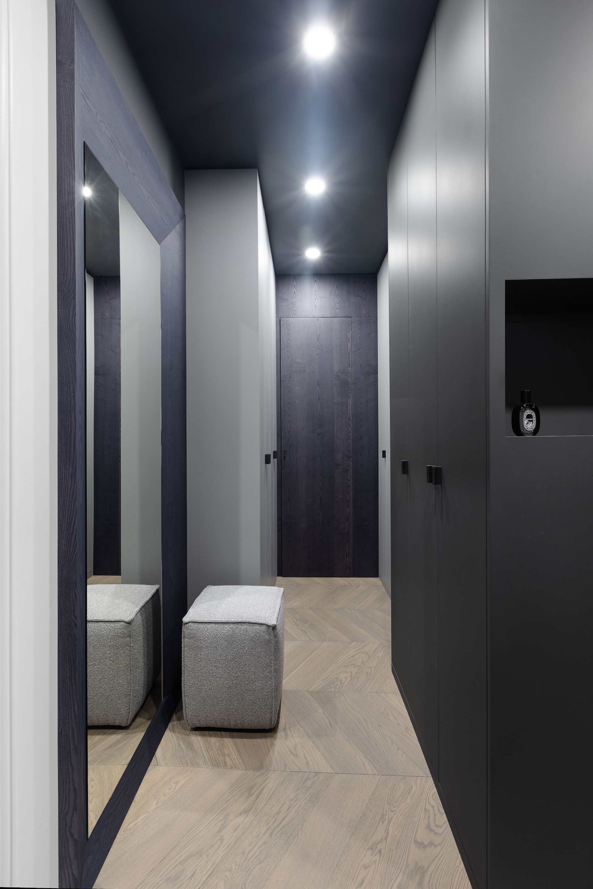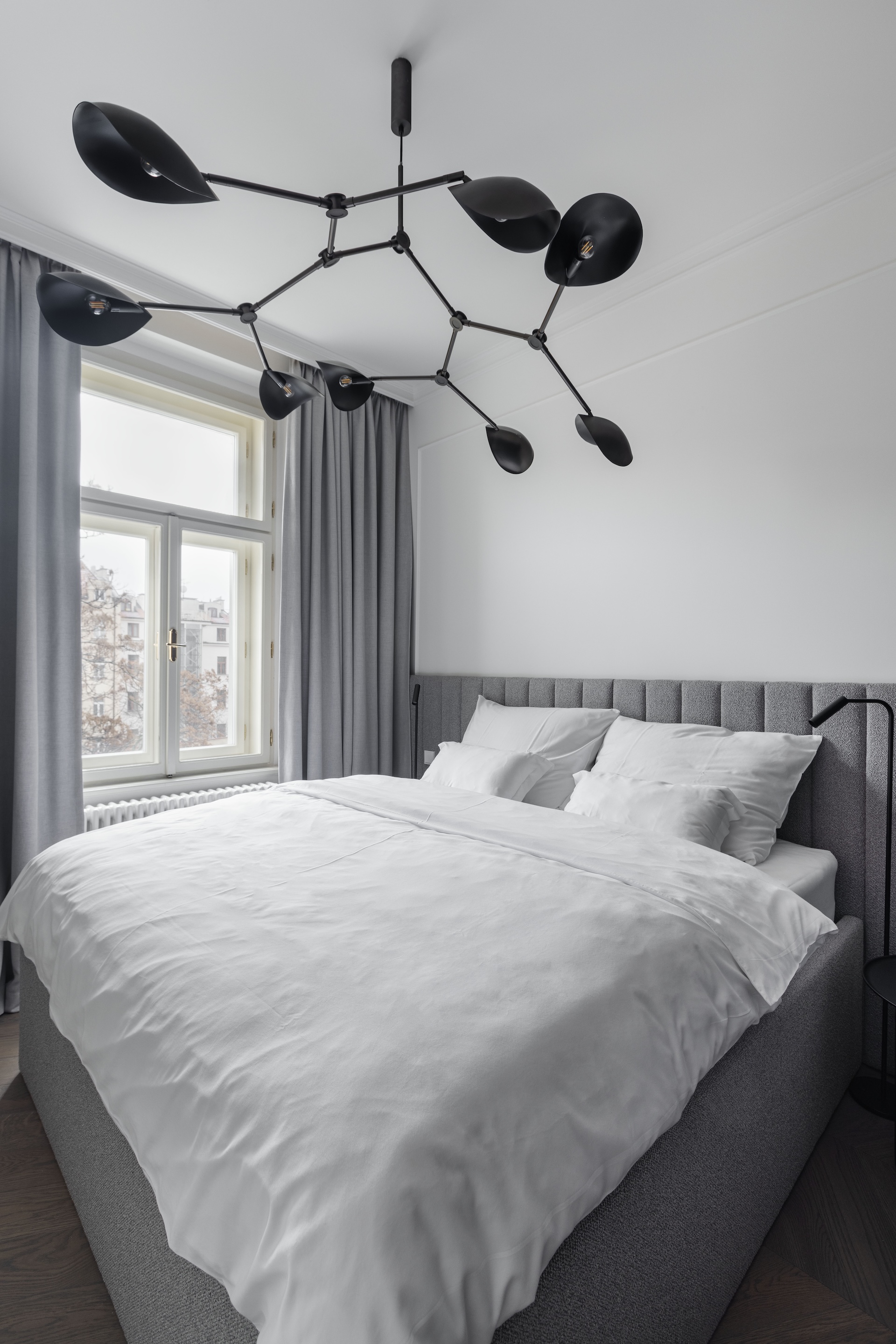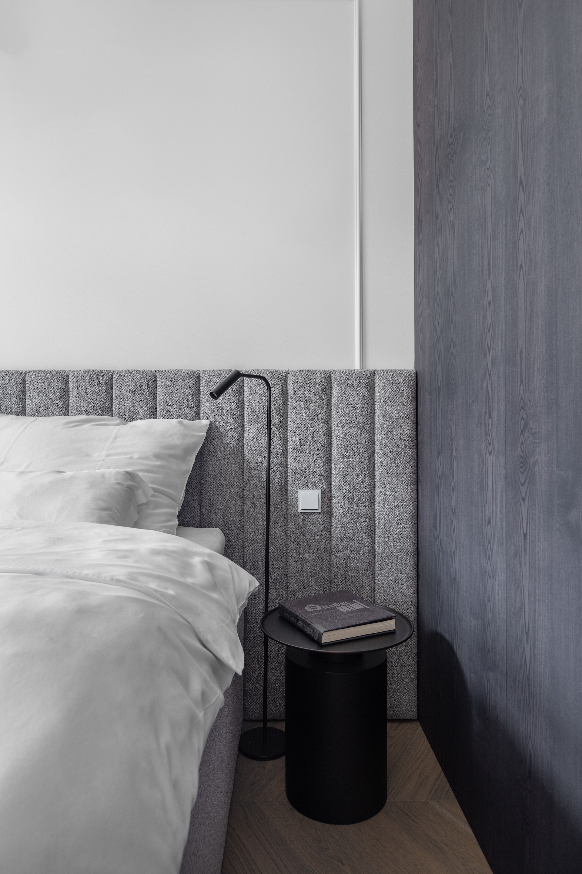 Byt nabízí dvě ložnice a koupelnu s toaletou, zařízenou v minimalistickém stylu s důrazem na detail a funkčnost. Světlé barevné tóny, dřevěné podlahy a prosklené prvky vytvářejí vzdušnou a harmonickou atmosféru celého bytu.