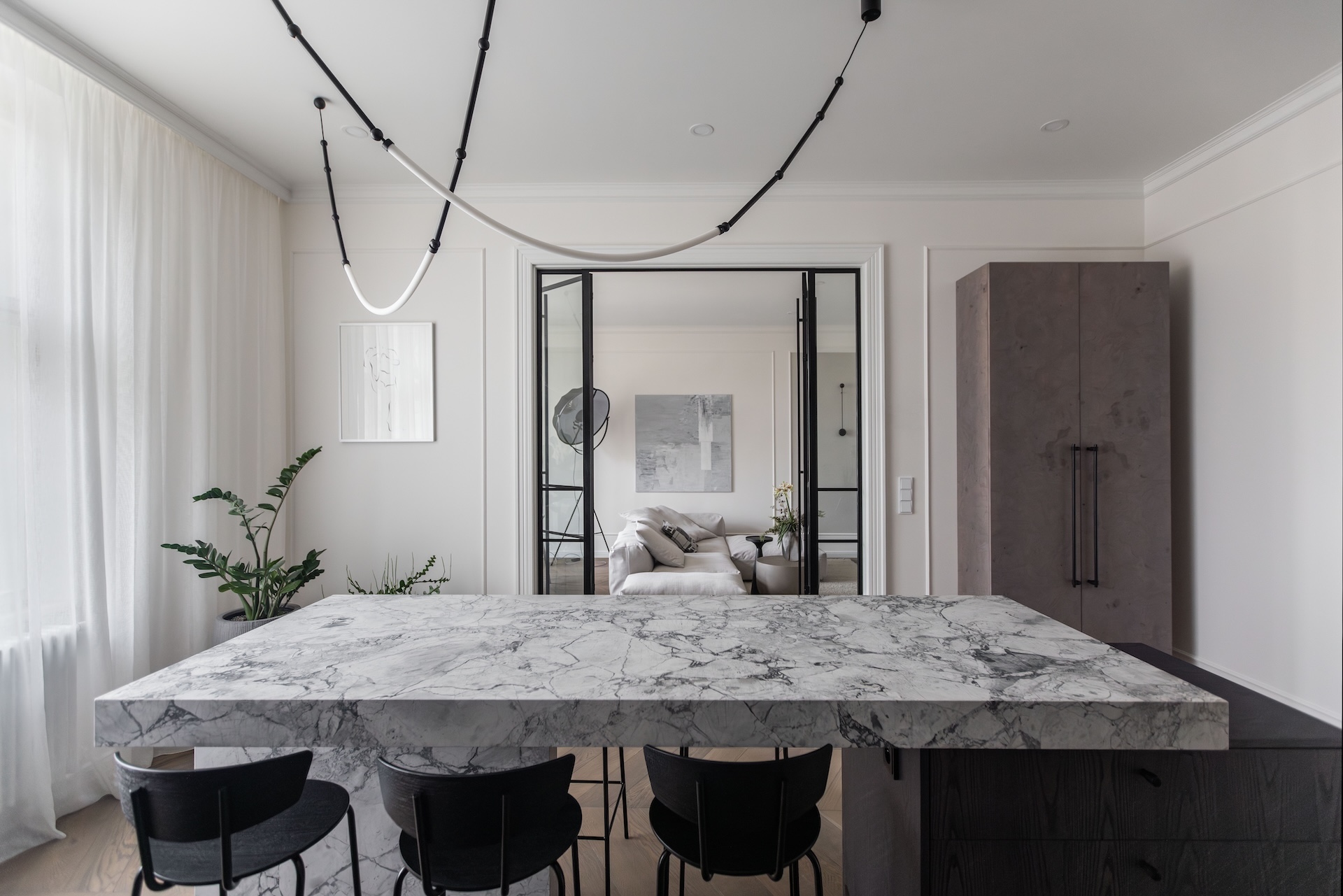 Interiér zaujme promyšlenou dispozicí a nadčasovým designem. Dominantou je hlavní obytná část, která spojuje obývací pokoj s plně vybavenou kuchyní a jídelním koutem. Kuchyň je vybavena špičkovými spotřebiči Siemens Black series, které splňují nejvyšší nároky na komfort i estetiku.