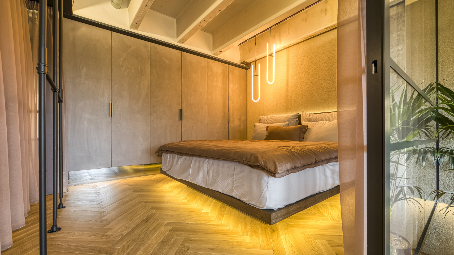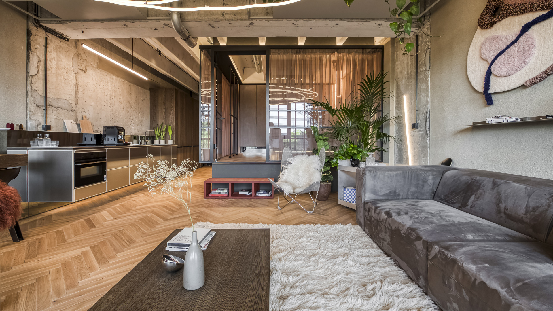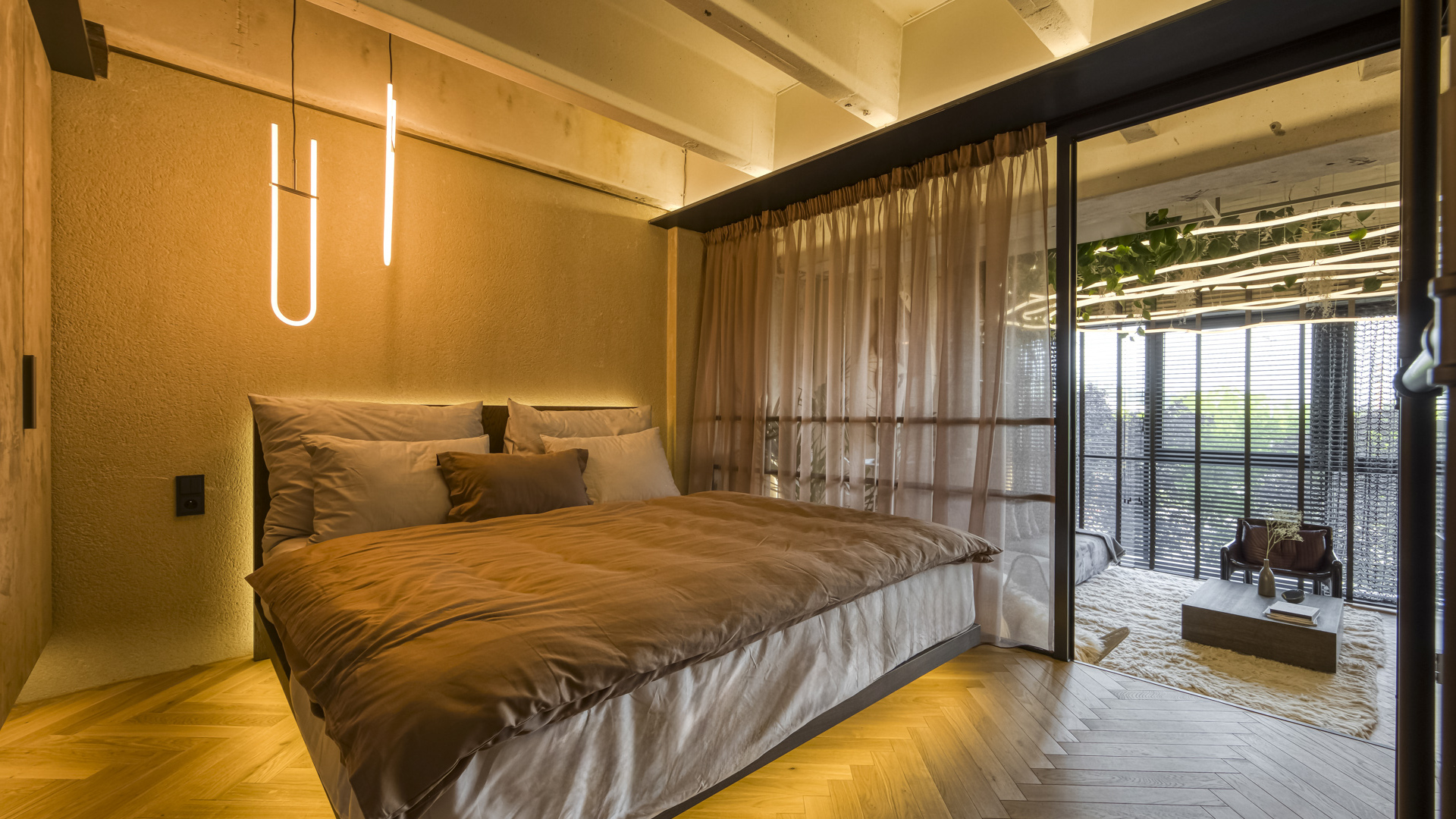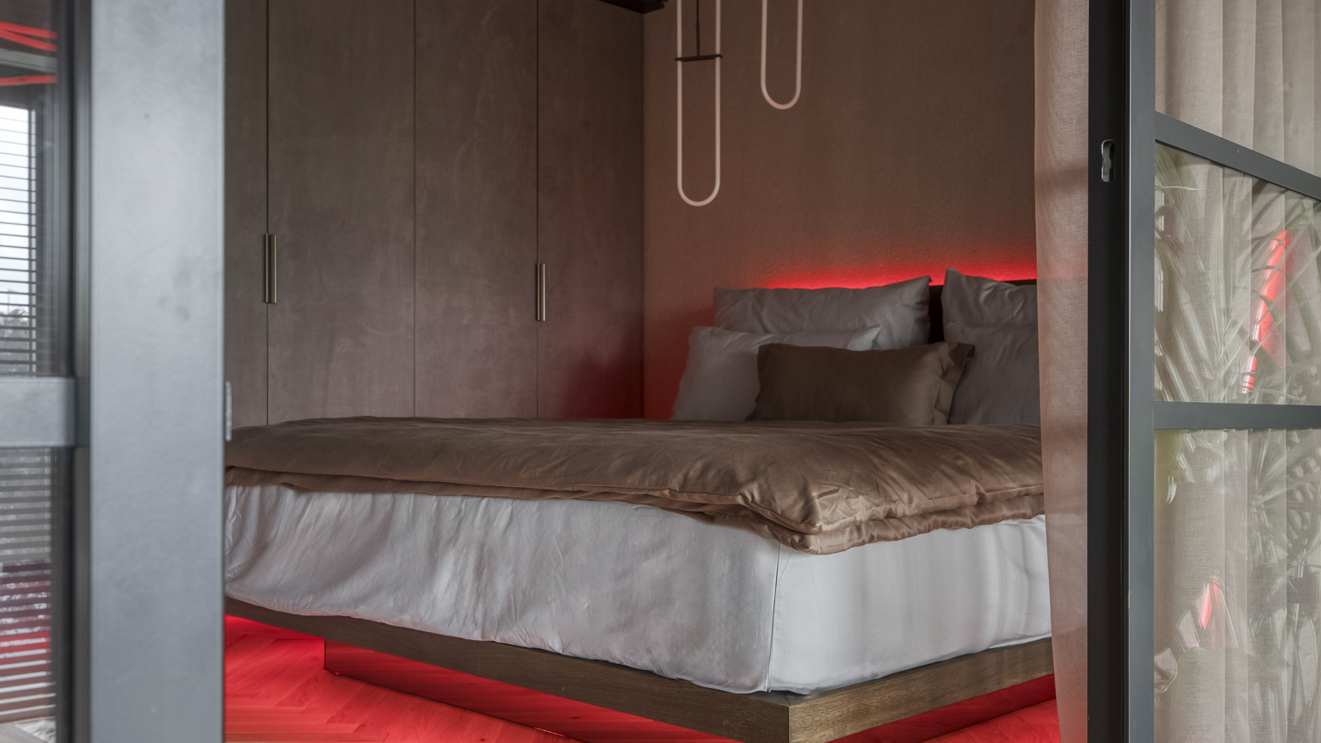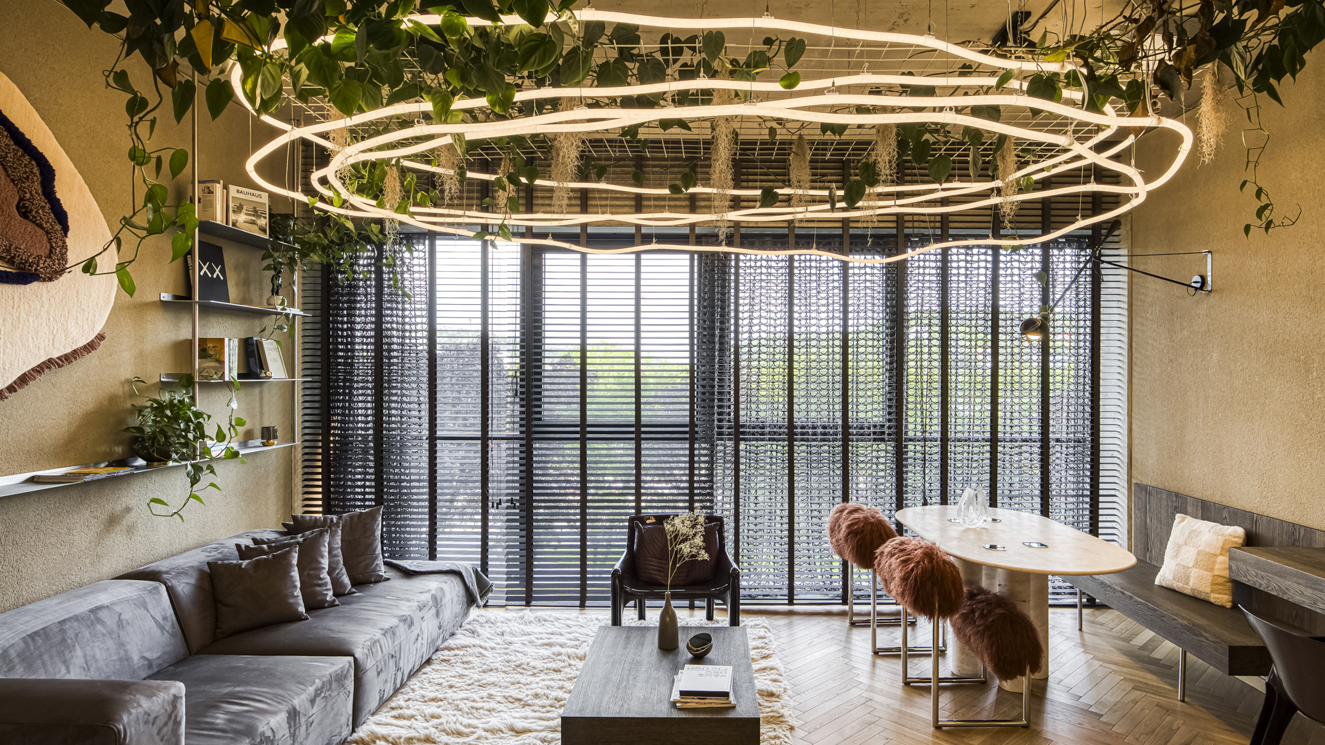 Dalším výrazným rysem loftu je variabilita při vytváření atmosféry. Sofistikované ambientní osvětlení umožňuje měnit charakter prostoru podle nálady či příležitosti. Útulný byt s osvětlením v hřejivých a teplých barvách se tak může v jednom okamžiku změnit v moderní a stylový interiér s futuristickým nádechem – rozdíl, který je patrný i ve dne, ale nejvíce vynikne v nočních hodinách. Celek doplňuje originální stropní konstrukce určená k pokrytí popínavou zelení, která přináší do interiéru svěží přírodní prvek a vytváří působivý kontrast k industriálnímu charakteru loftu. Byt se prodává kompletně vybavený.
