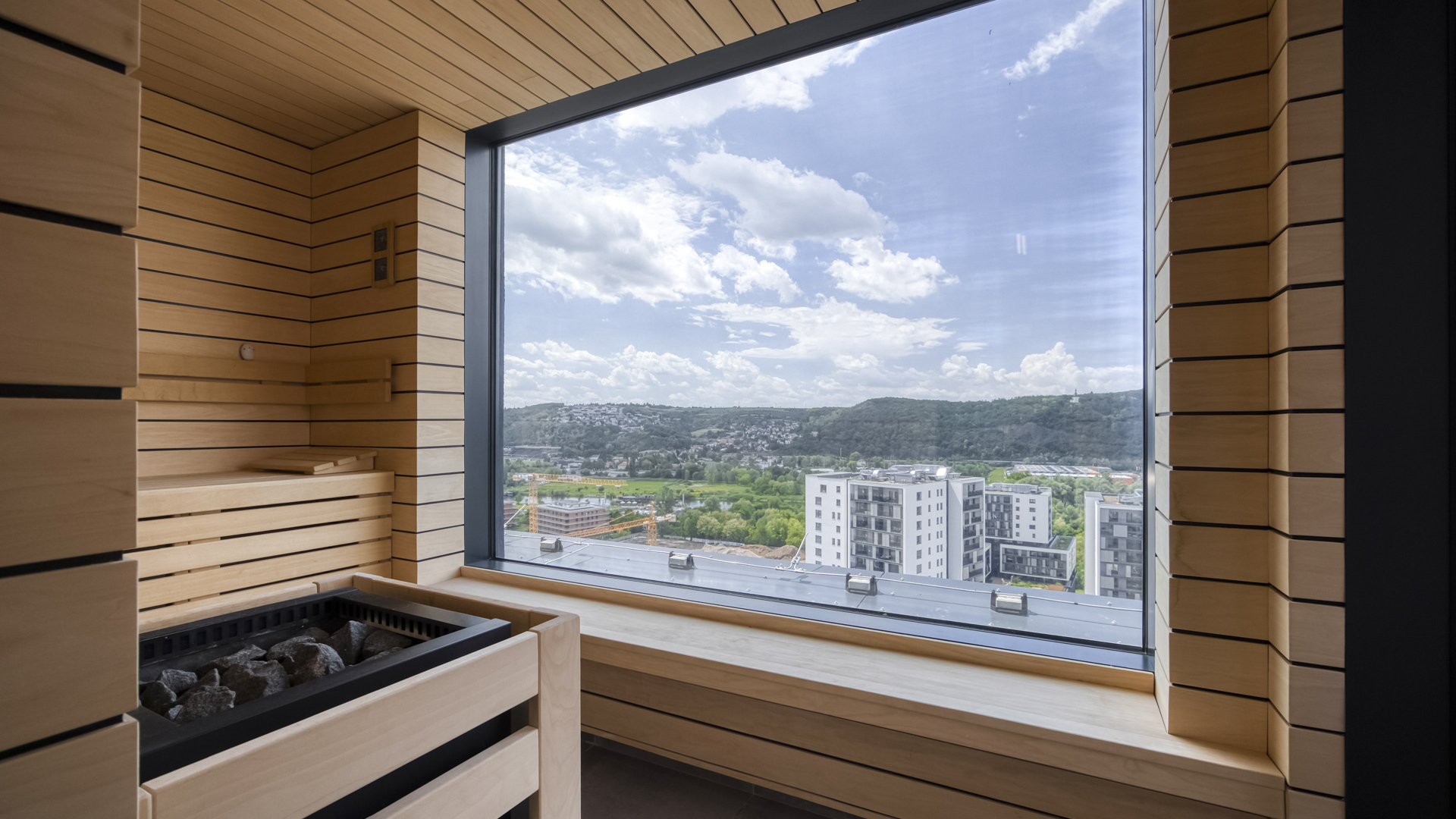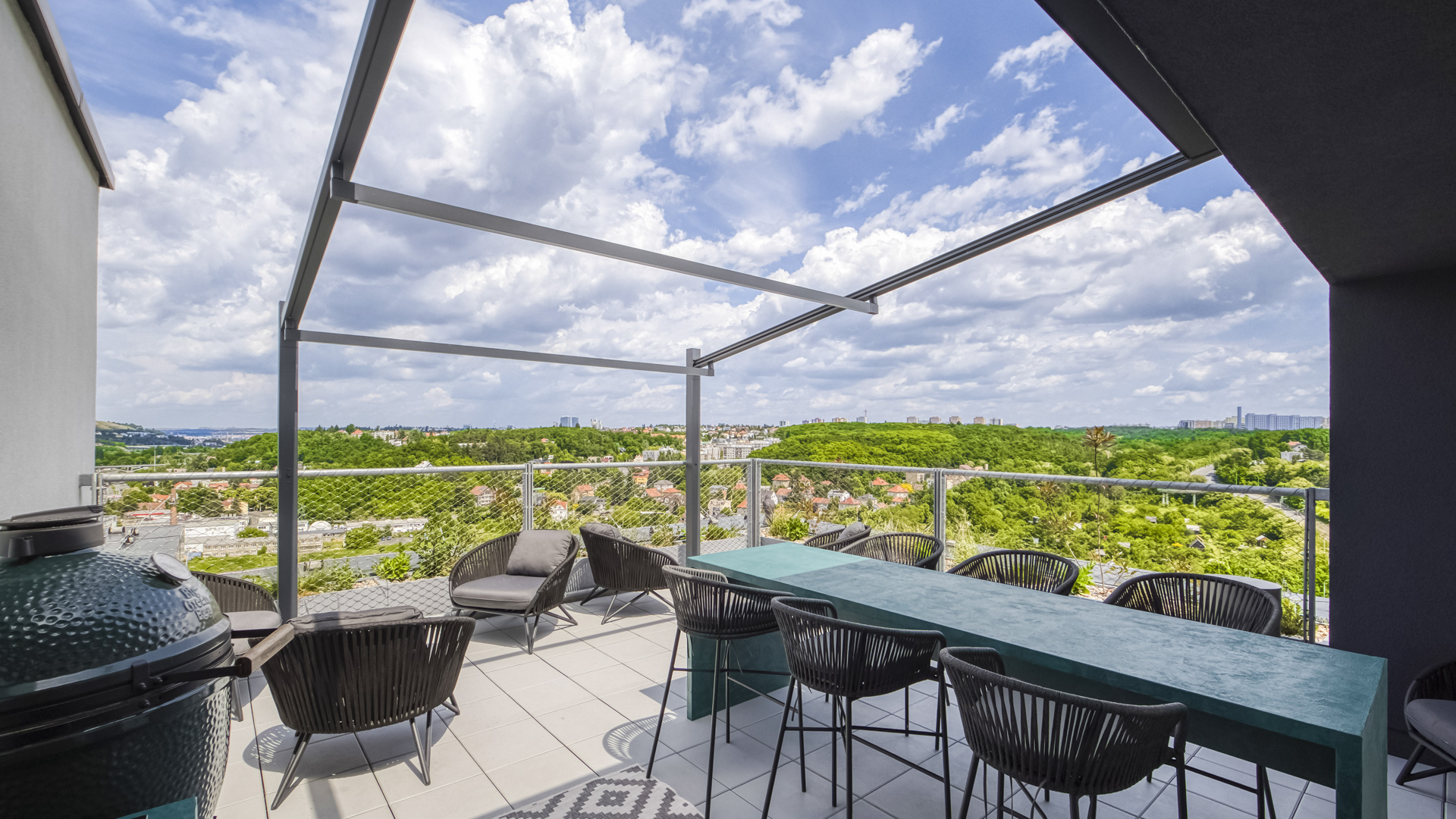 - Unikátní společné prostory – bazén, fitness, kino, grilovací terasa na střeše projektu