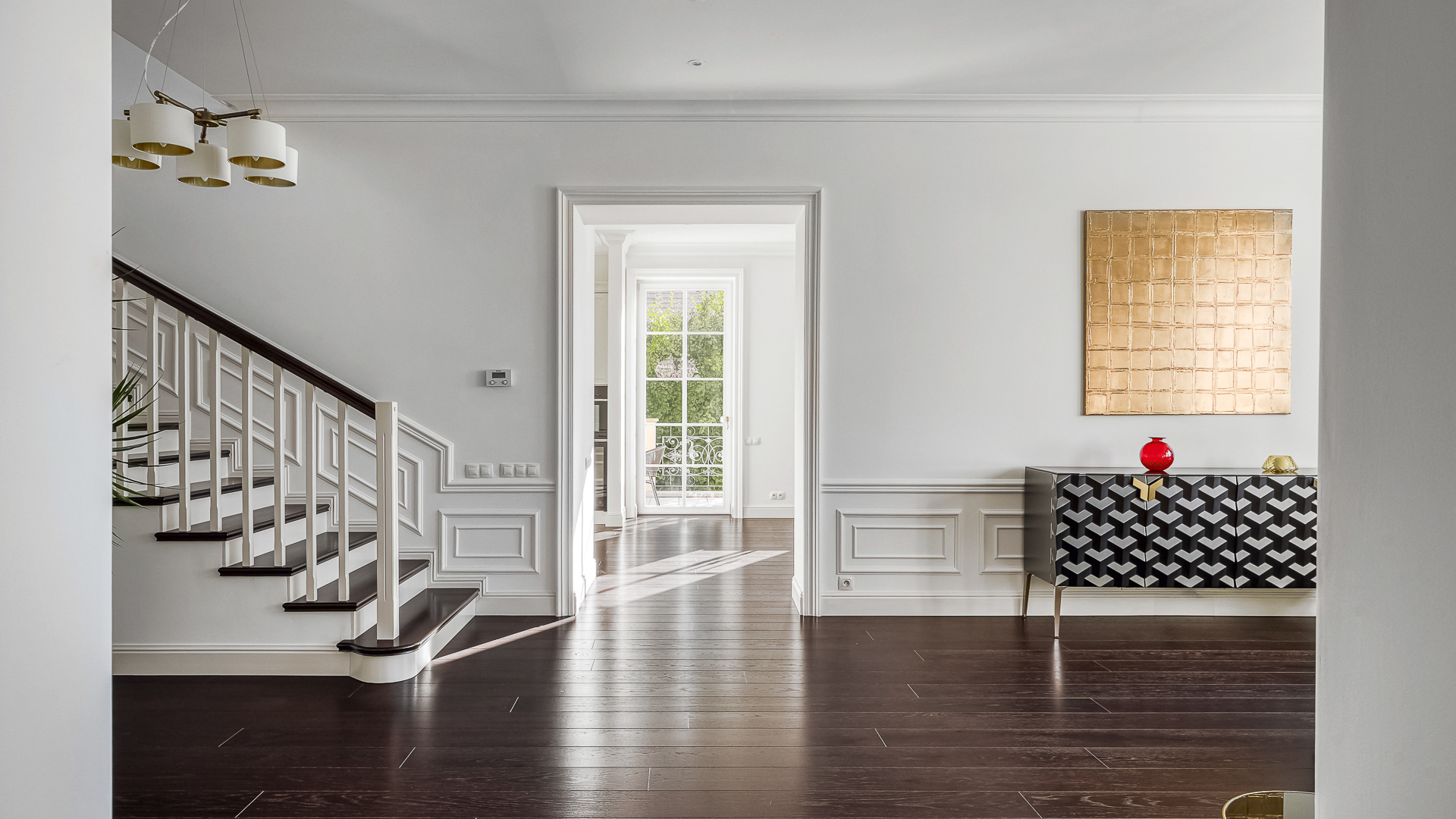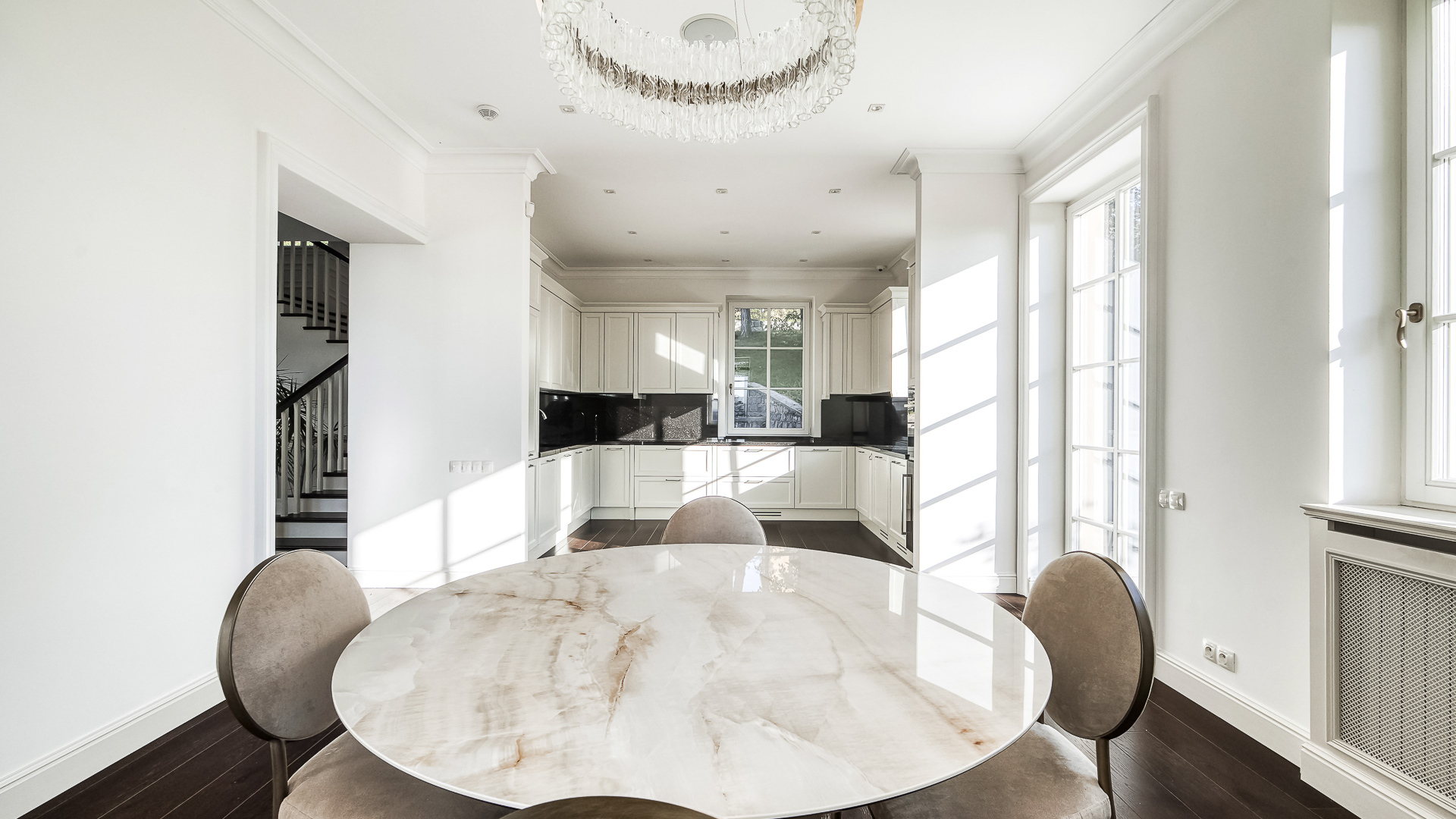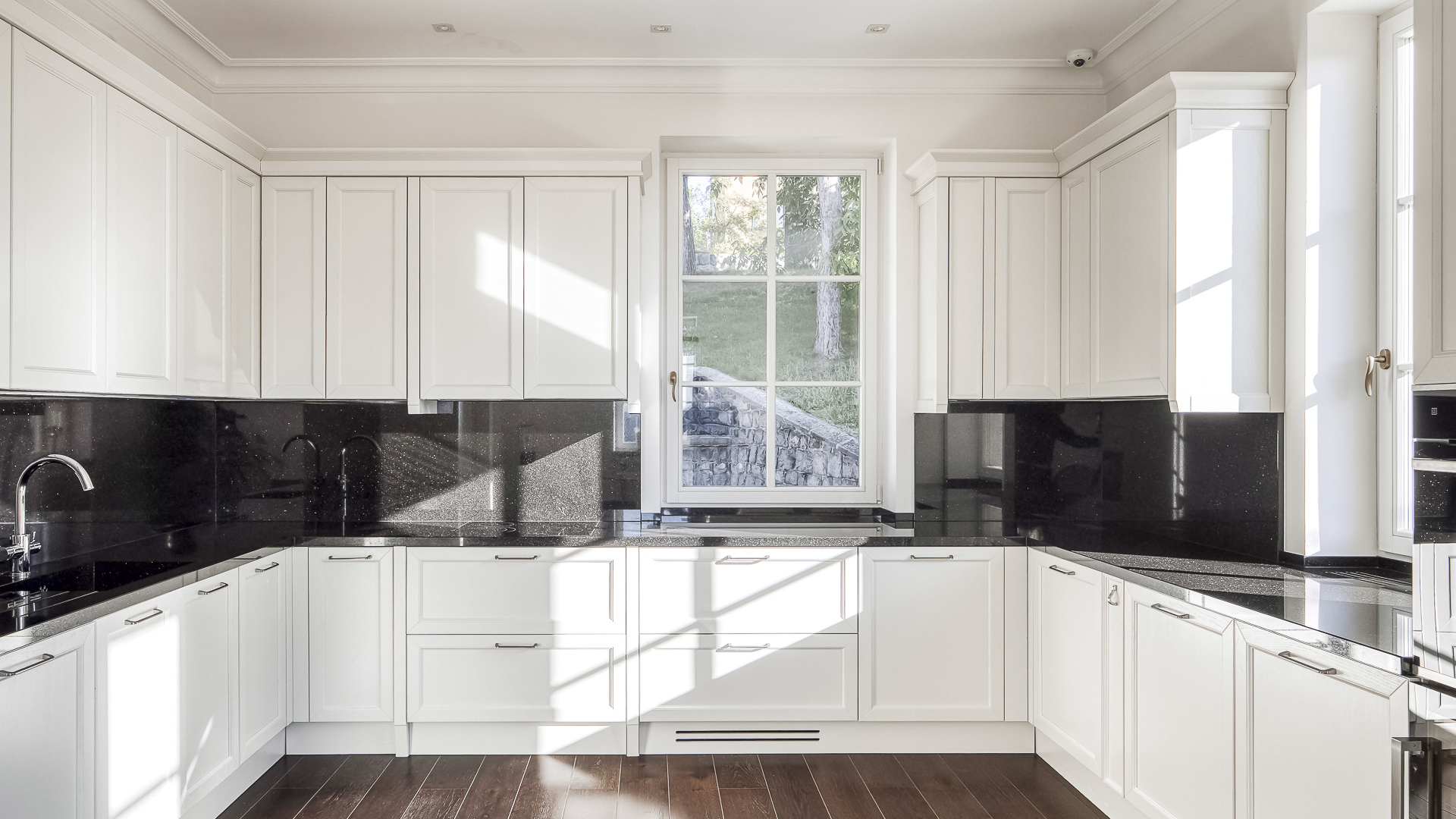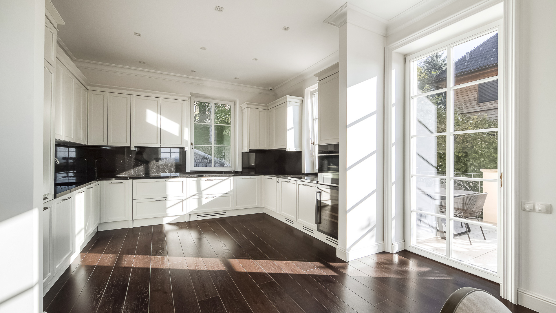Interiér je zpracován s mimořádnou péčí a důrazem na kvalitu. Podlahy tvoří luxusní dřevěná krytina Kährs Dub Classic Nouveau Black mat, jejíž tmavý matný odstín dodává prostoru eleganci a hloubku. Kuchyň i vestavěný nábytek byly realizovány na míru renomovanou italskou společností Old Line, která se podílela i na vybavení šaten. Koupelny jsou osazeny exkluzivní sanitární technikou Devon & Devon, symbolem italského designu a precizního řemesla. Vila nabízí čtyři koupelny, prostornou terasu a balkon s výhledem do pečlivě udržované zahrady.