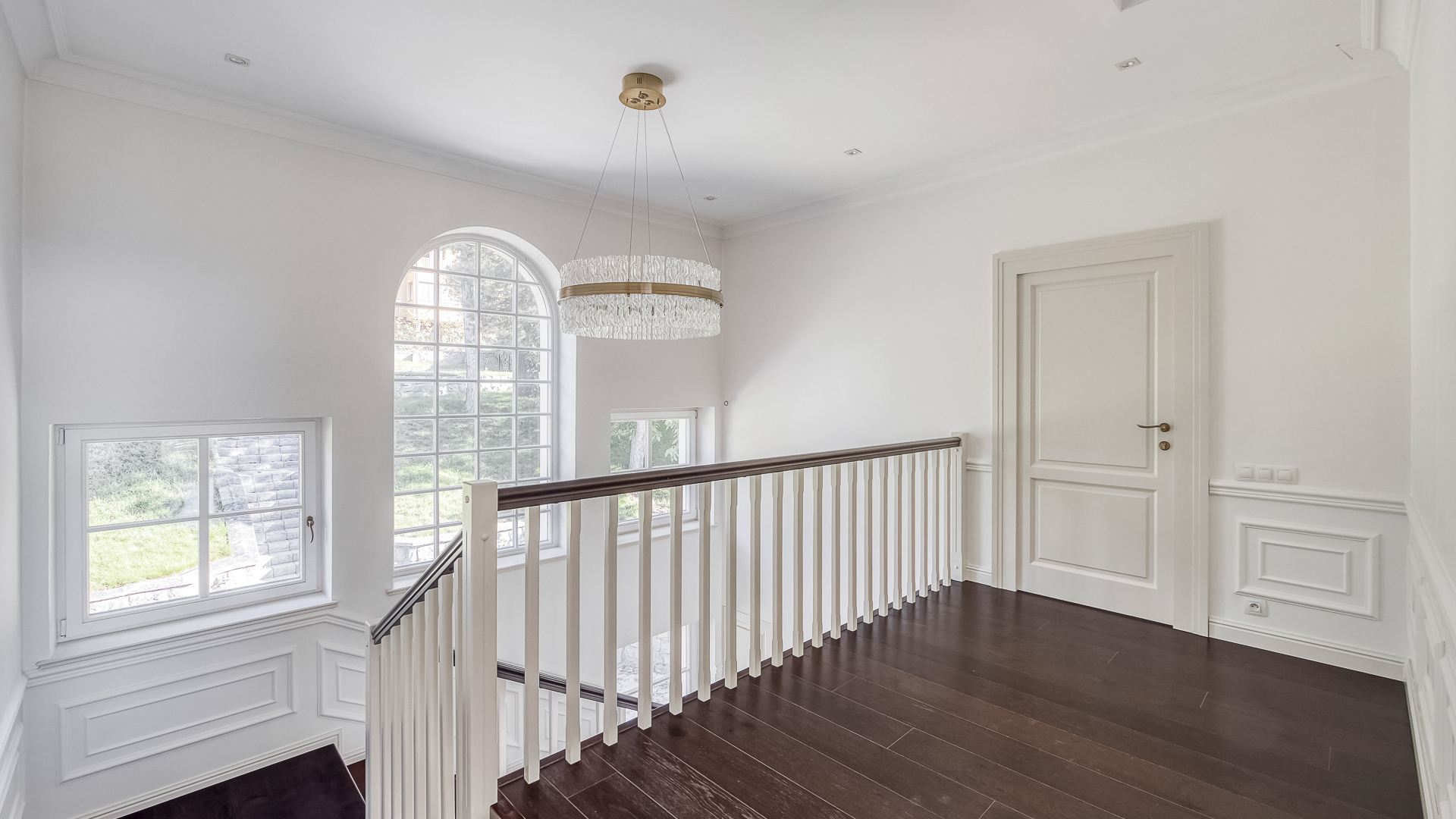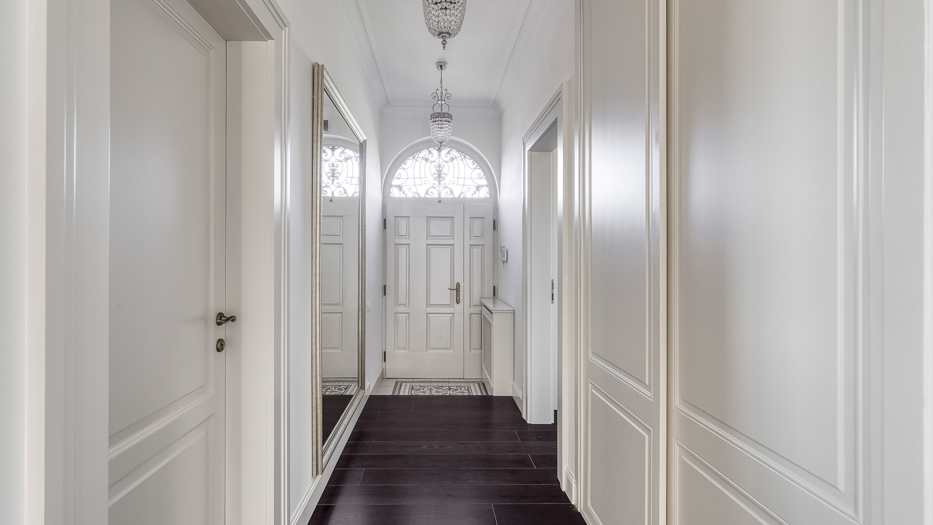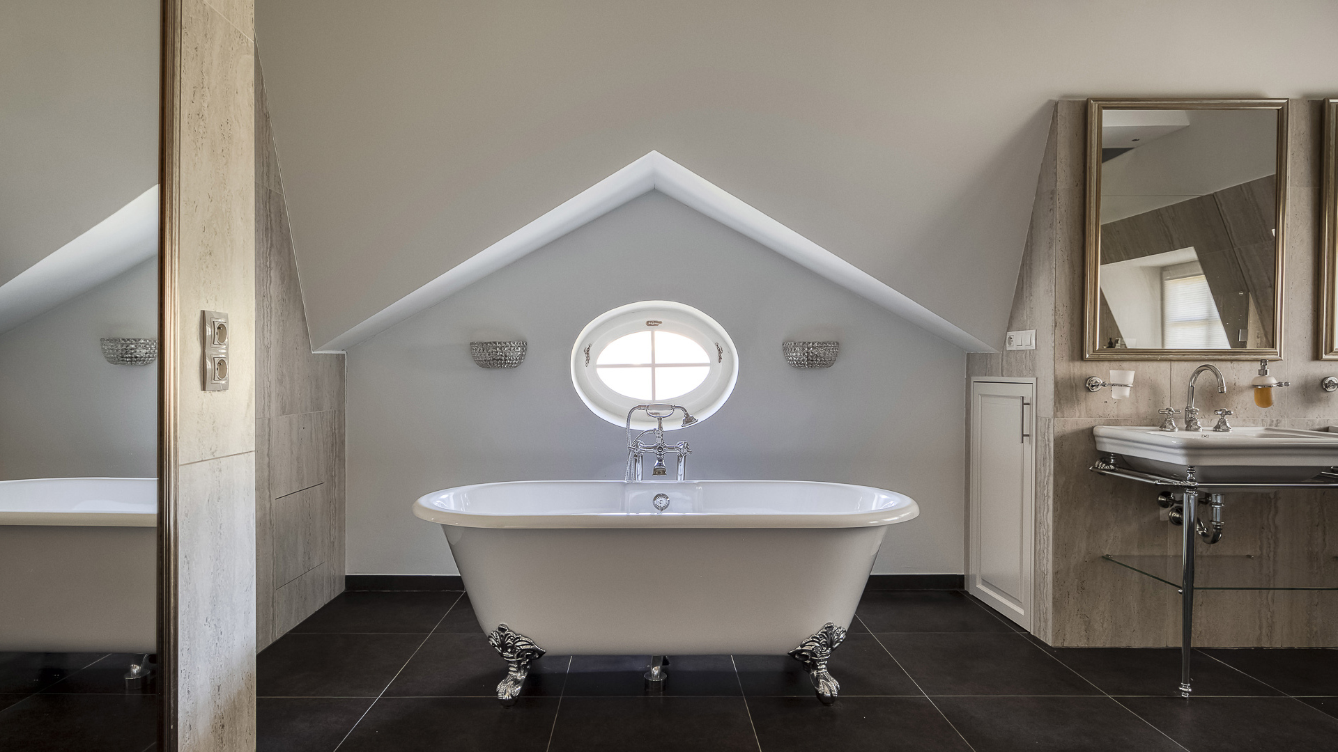 Interiér je zpracován s mimořádnou péčí a důrazem na kvalitu. Podlahy tvoří luxusní dřevěná krytina Kährs Dub Classic Nouveau Black mat, jejíž tmavý matný odstín dodává prostoru eleganci a hloubku. Kuchyň i vestavěný nábytek byly realizovány na míru renomovanou italskou společností Old Line, která se podílela i na vybavení šaten. Koupelny jsou osazeny exkluzivní sanitární technikou Devon & Devon, symbolem italského designu a precizního řemesla. Vila nabízí čtyři koupelny, prostornou terasu a balkon s výhledem do pečlivě udržované zahrady.