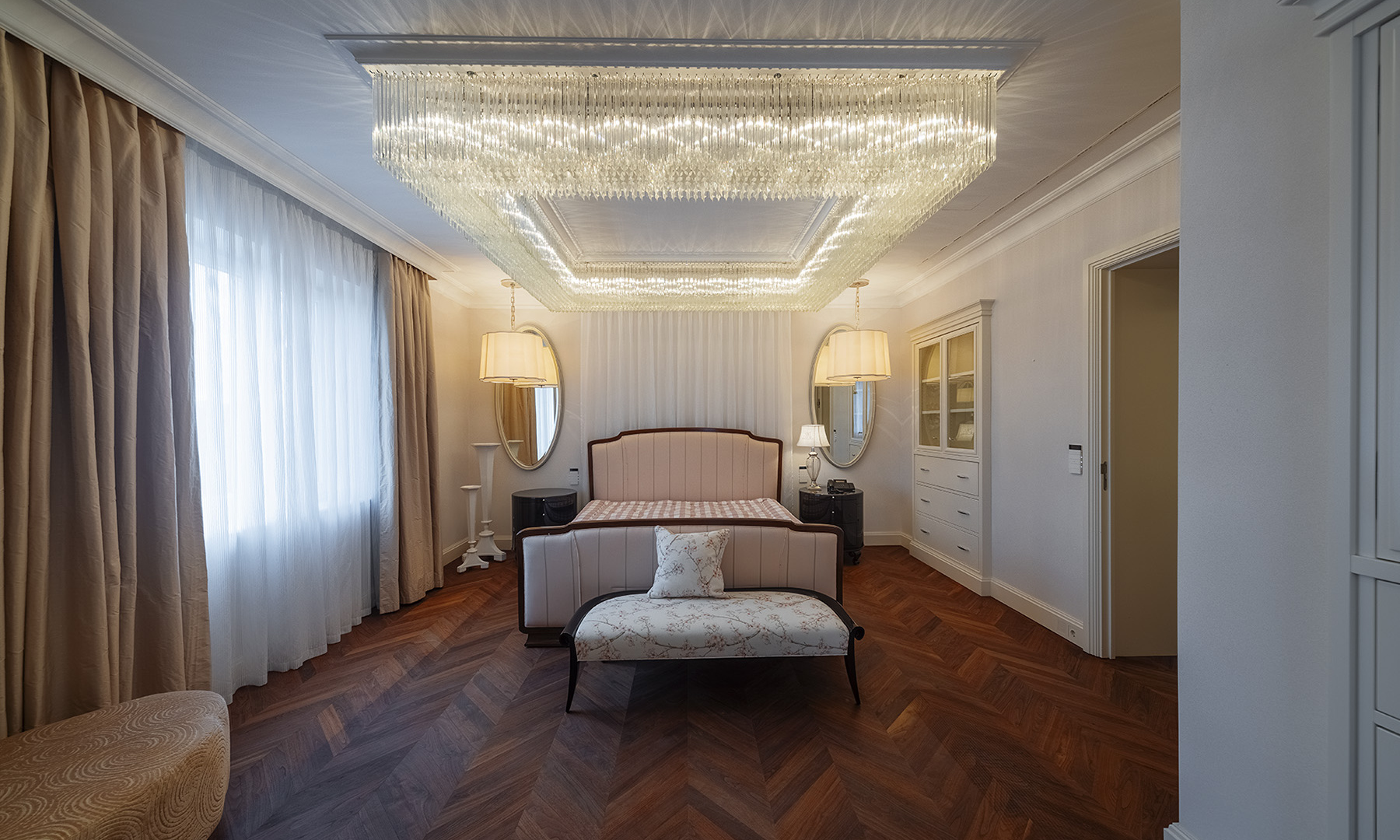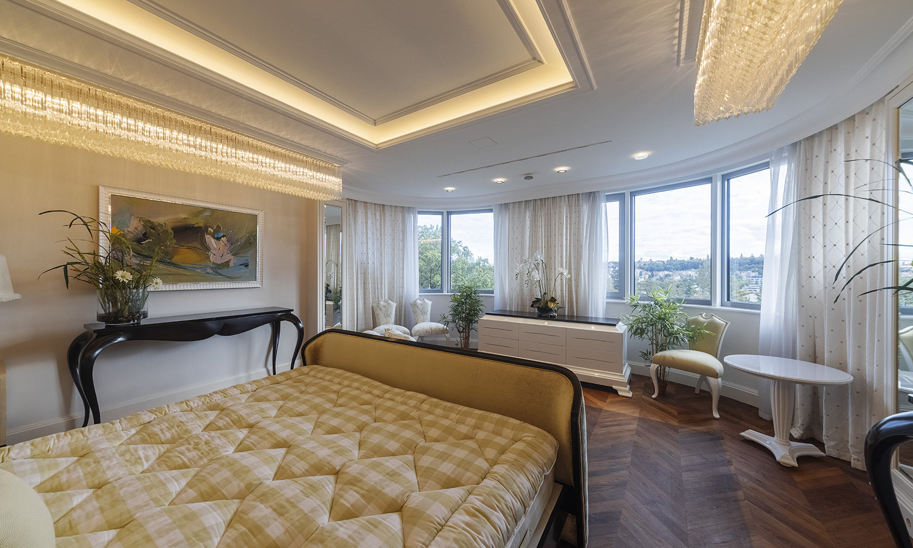 Ve čtyřech patrech s obytnou plochou 702 m² najdete tři ložnice, každá s vlastní velmi prostornou šatnou a koupelnou, tři pracovny, knihovnu, otevřené obývací patro kombinující obývací pokoj s krbem na dřevo, jídelnu, kuchyň a billiard. Pro relaxaci je vila vybavena vnitřním bazénem, saunou, fitness a barem.