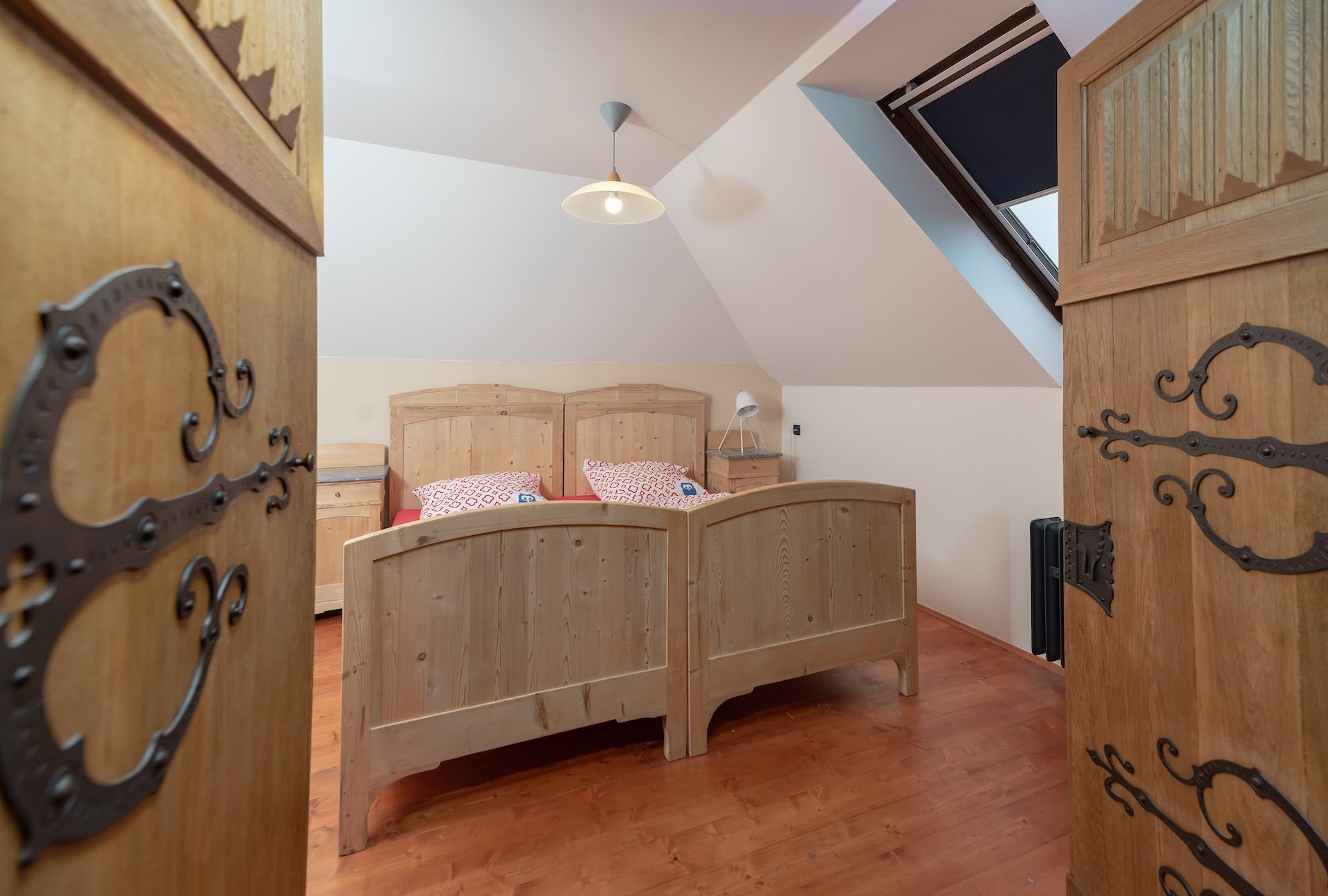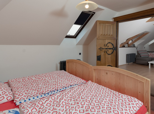 The pleasant attic duplex has an above-standard living area of 180 sqm. The apartment is dominated by romantic beams, wooden elements then intertwine throughout the apartment. The apartment has a total of two double bedrooms, a built-in upper floor with the possibility of accomodating up to four people, two bathrooms, and one separate toilet. The social area consists of an open fully equipped kitchen, which freely transitions into a spacious living room with a fireplace, which underlines the romantic mountain atmosphere.