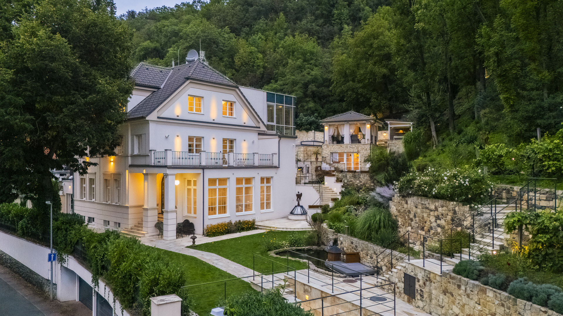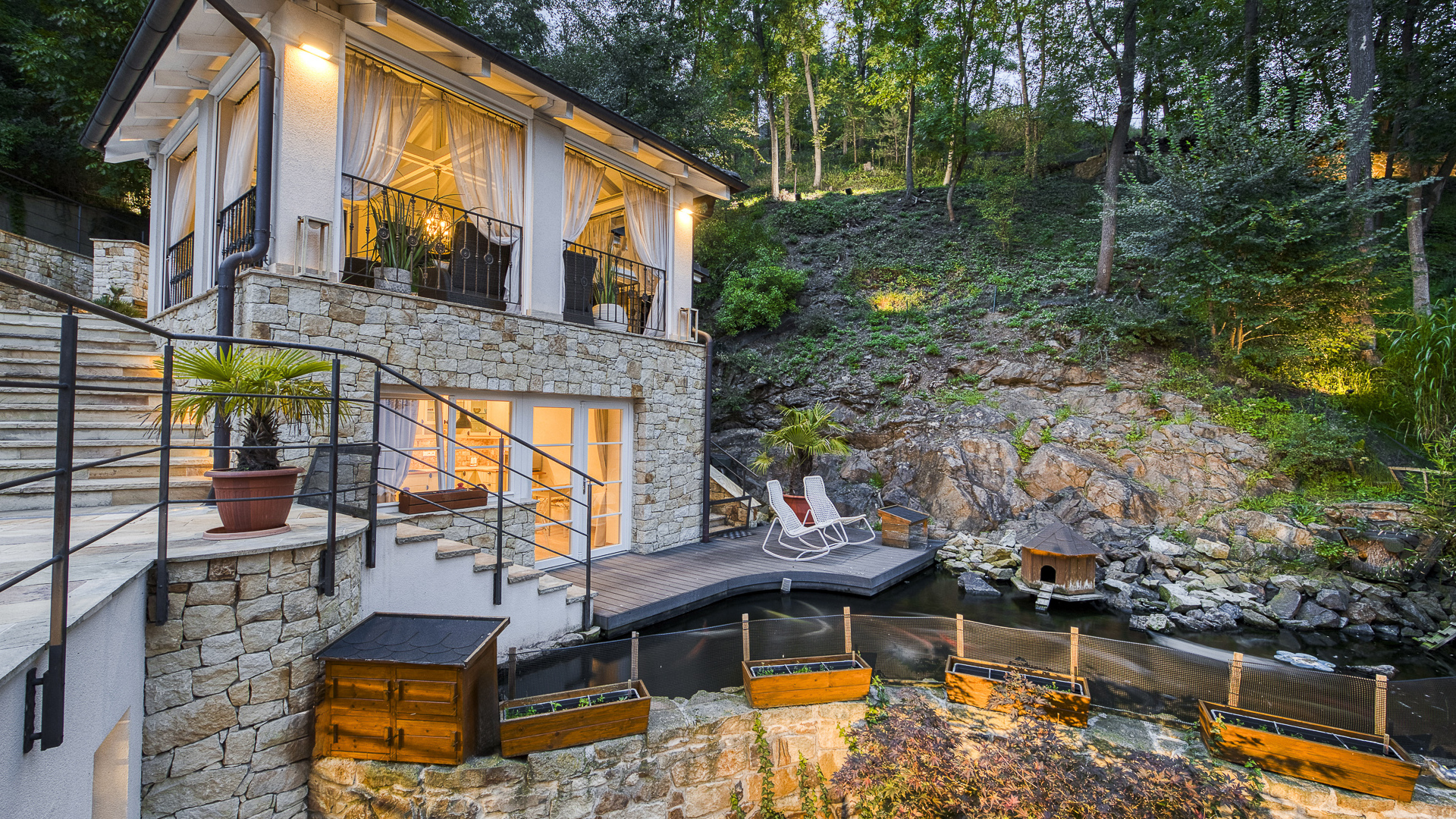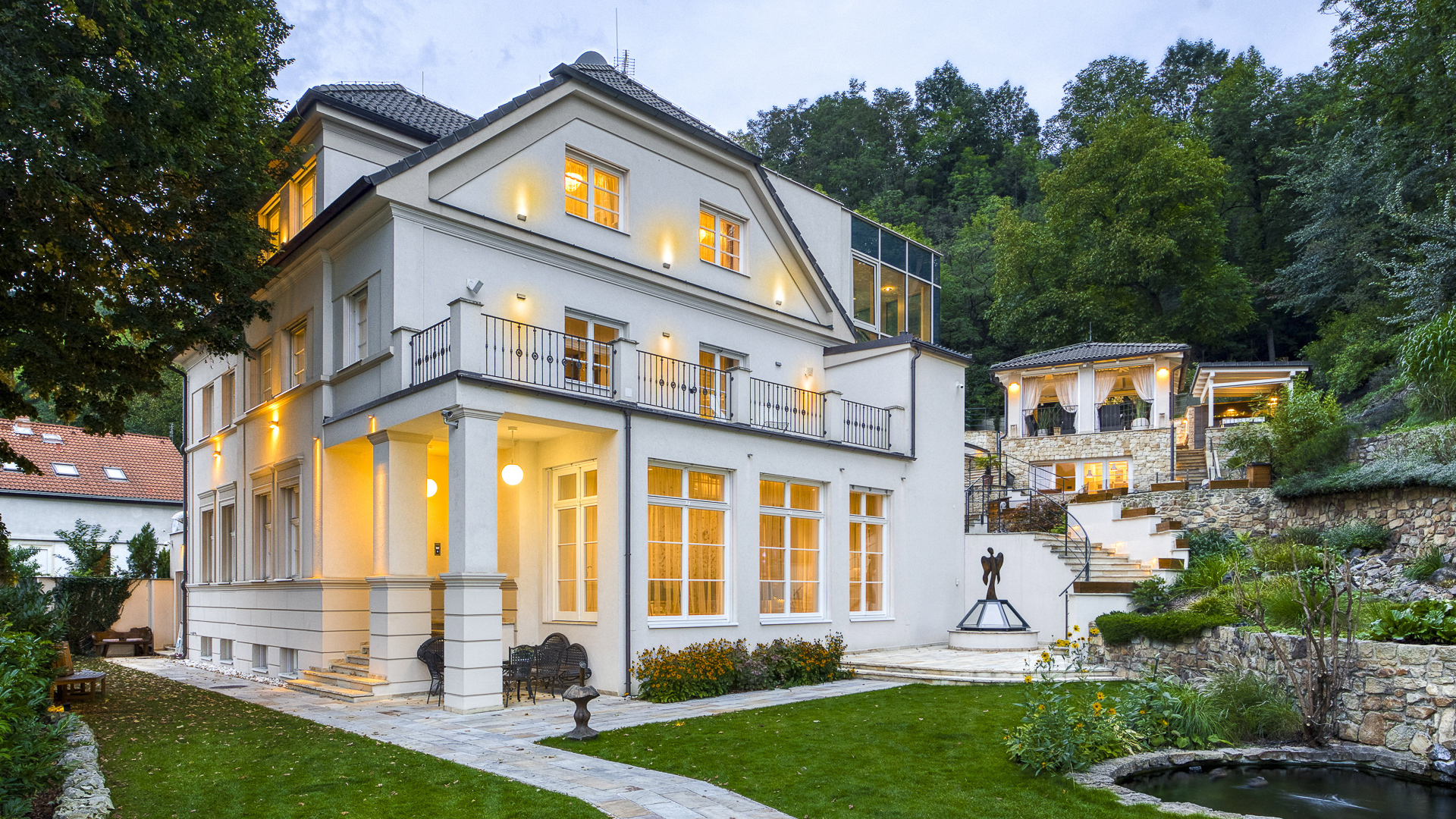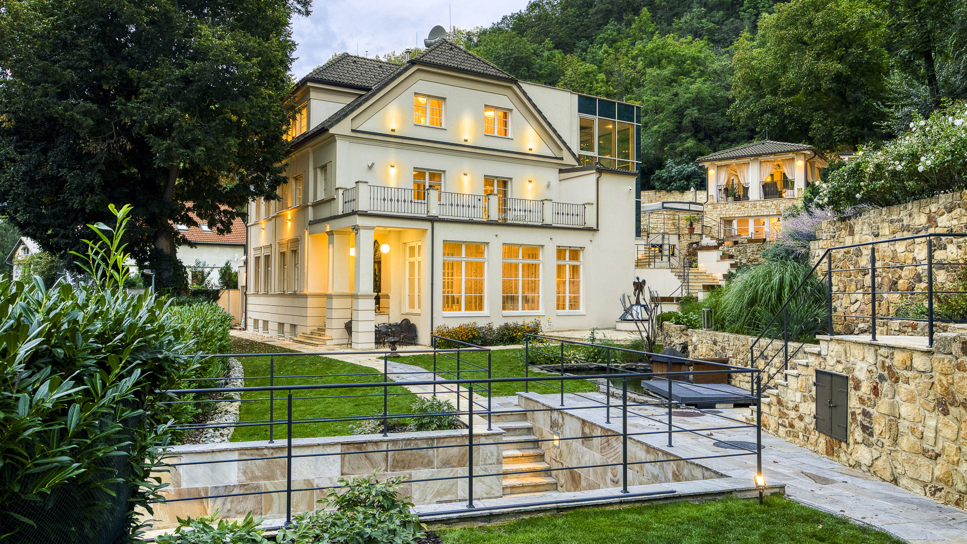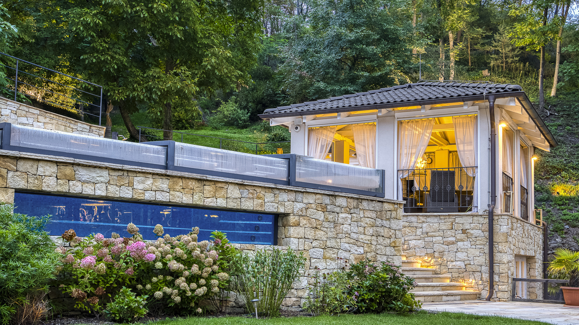 From the kitchen you can also enter the back part of the garden with an outdoor covered seating area with a pizza oven, a swimming pool with a waterfall, an outdoor kitchen and a gazebo with heaters and roller blinds for garden parties with a beautiful view of the surrounding valley. In this part of the garden there is also a second separate apartment with a kitchenette and a bathroom.