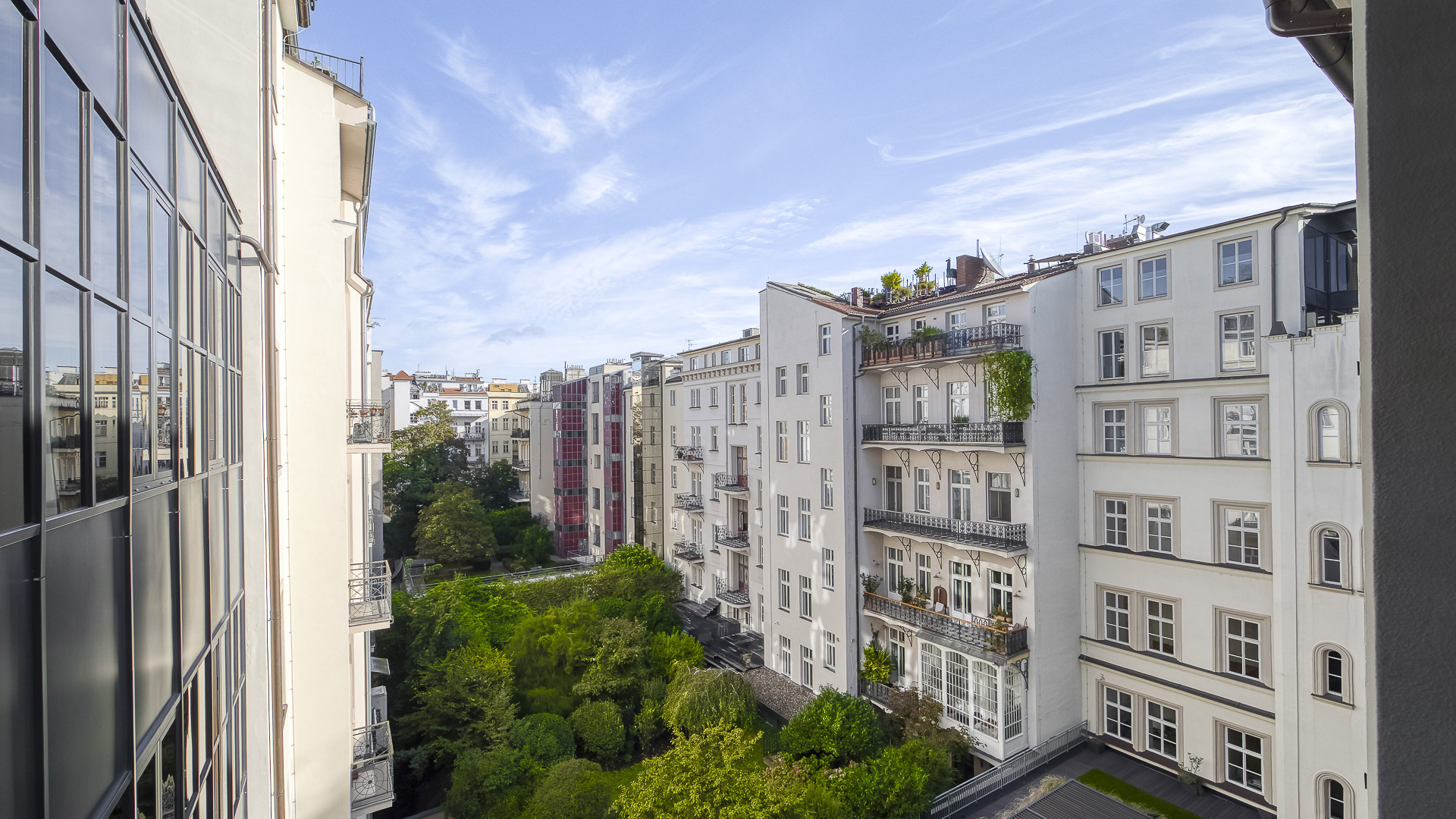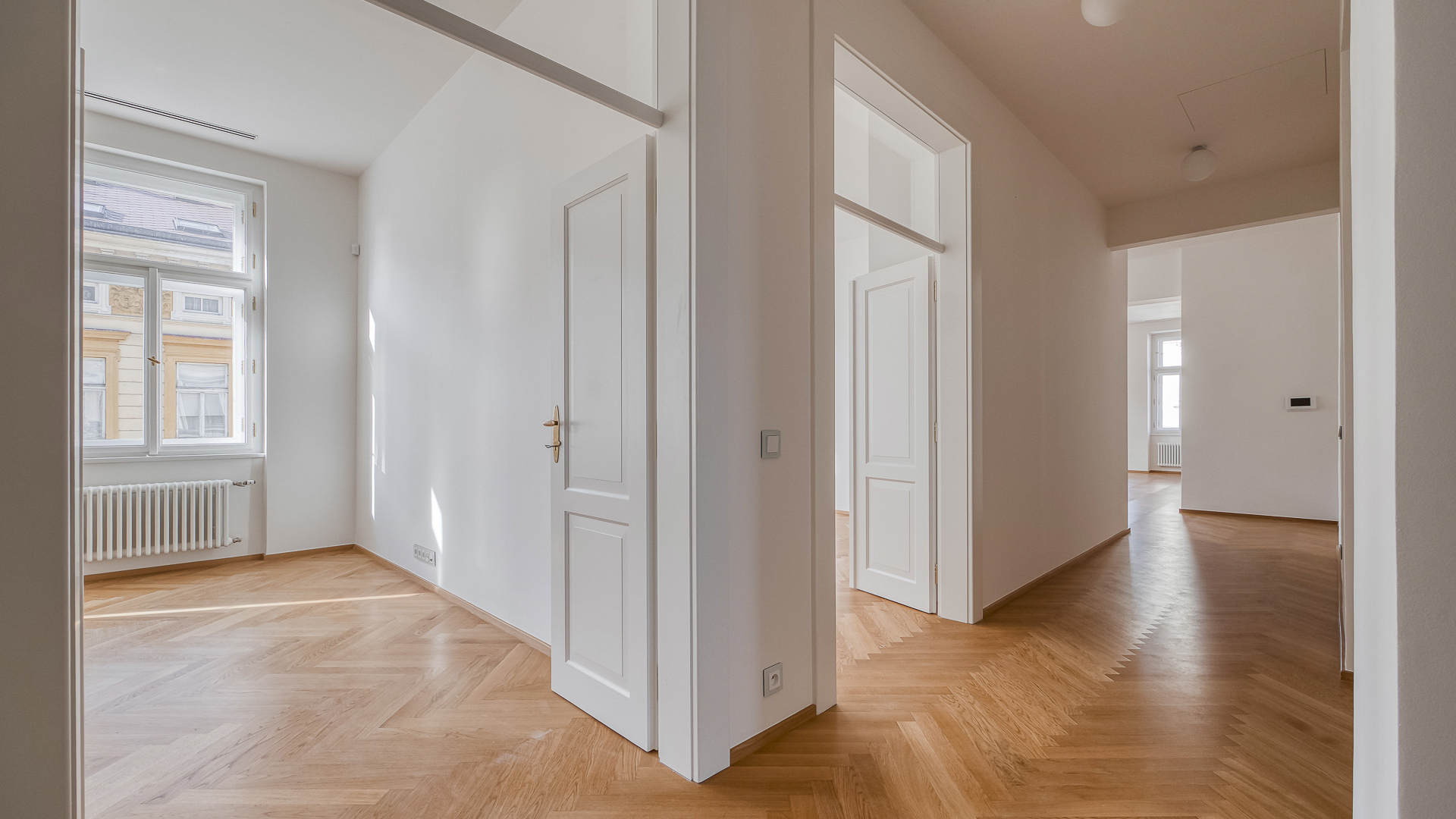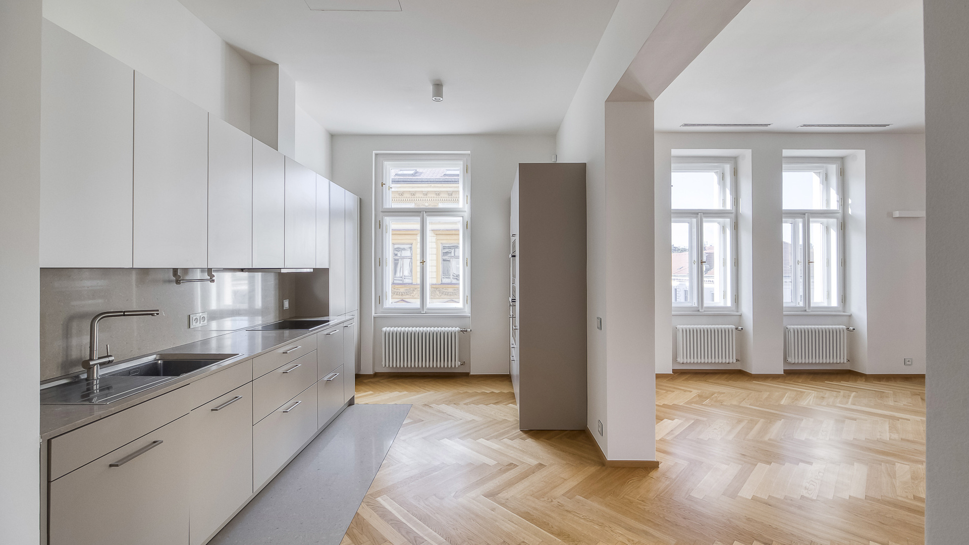 The apartment has a spacious living room connected to a kitchenette. The kitchen is fully equipped with a SieMatic line and Miele appliances. The apartment also has 3 bedrooms, 2 facing Petřínská Street, one facing the courtyard with a garden for maximum peace. This bedroom has its own bathroom, another bathroom and a separate toilet are located in the hallway. Enough storage space is provided by built-in wardrobes located in all bedrooms.