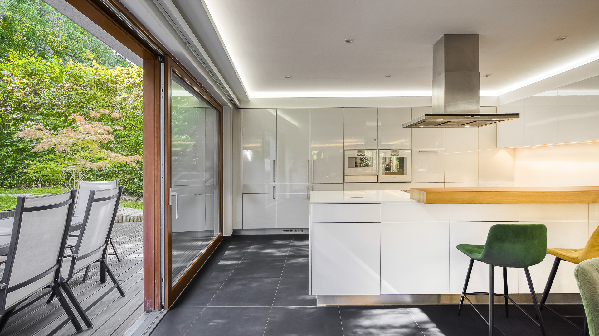 On the ground floor, there is a living room with a generously designed kitchen fitted with premium Gaggenau appliances and a dining area. From this space, large sliding doors lead to the adjoining outdoor terrace with a pool and barbecue facilities. The ground floor layout is further complemented by a guest room, entrance hall, main hallway, and bathroom with toilet. There is also a garage, beneath which is a cellar serving as a utility and storage area.