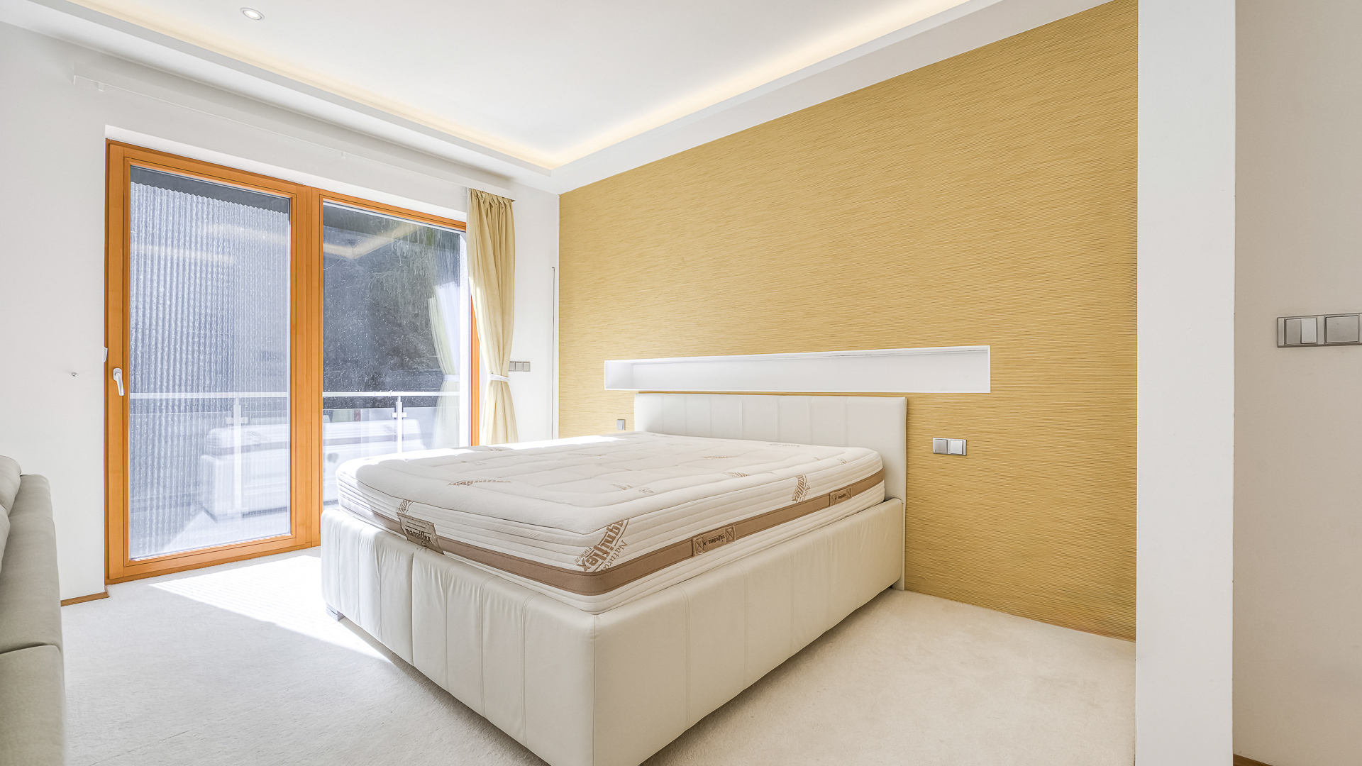 A stylish glass staircase leads to the middle floor, which contains most of the bedrooms. Here you will find one of the main bedrooms with an en-suite bathroom, a separate walk-in closet, and a balcony overlooking the garden. There are also two additional bedrooms, each with its own bathroom – one of them designed as a playful children’s room with hideaways. The top floor features the largest bedroom with a balcony once again facing the garden, along with a spacious home wellness area. This includes a twelve-meter swimming pool with counter-current, a steam shower, and a bathtub for several people, while a gas fireplace creates a cozy atmosphere for relaxation. The top floor can thus serve as a generous master suite with full facilities, yet the wellness area also has direct access from the corridor to ensure privacy if needed.