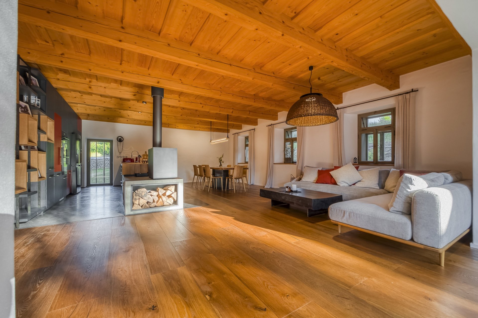 At the heart of the property lies a spacious living room on the ground floor of one of the cottages, featuring a fully equipped modern kitchen, dining area, and wood-burning stove. Floor-to-ceiling sliding glass doors flood the space with natural light and open directly onto the grassy courtyard, seamlessly connecting indoor and outdoor living, especially in the summer months. The ground floor further includes a generous bathroom with bathtub, a utility room, and a staircase leading both to a practical cellar and to the upper level. Here, two large bedrooms of over 30 sq. m each boast open lofted ceilings with exposed beams, creating an airy and bright atmosphere. Distinctive details such as original wooden wall panels, large-format tiles, hardwood floors, a fireplace, or freestanding bathtub elevate the interiors and lend them a refined yet cozy character. An additional guest bedroom and bathroom complete the upper floor.
