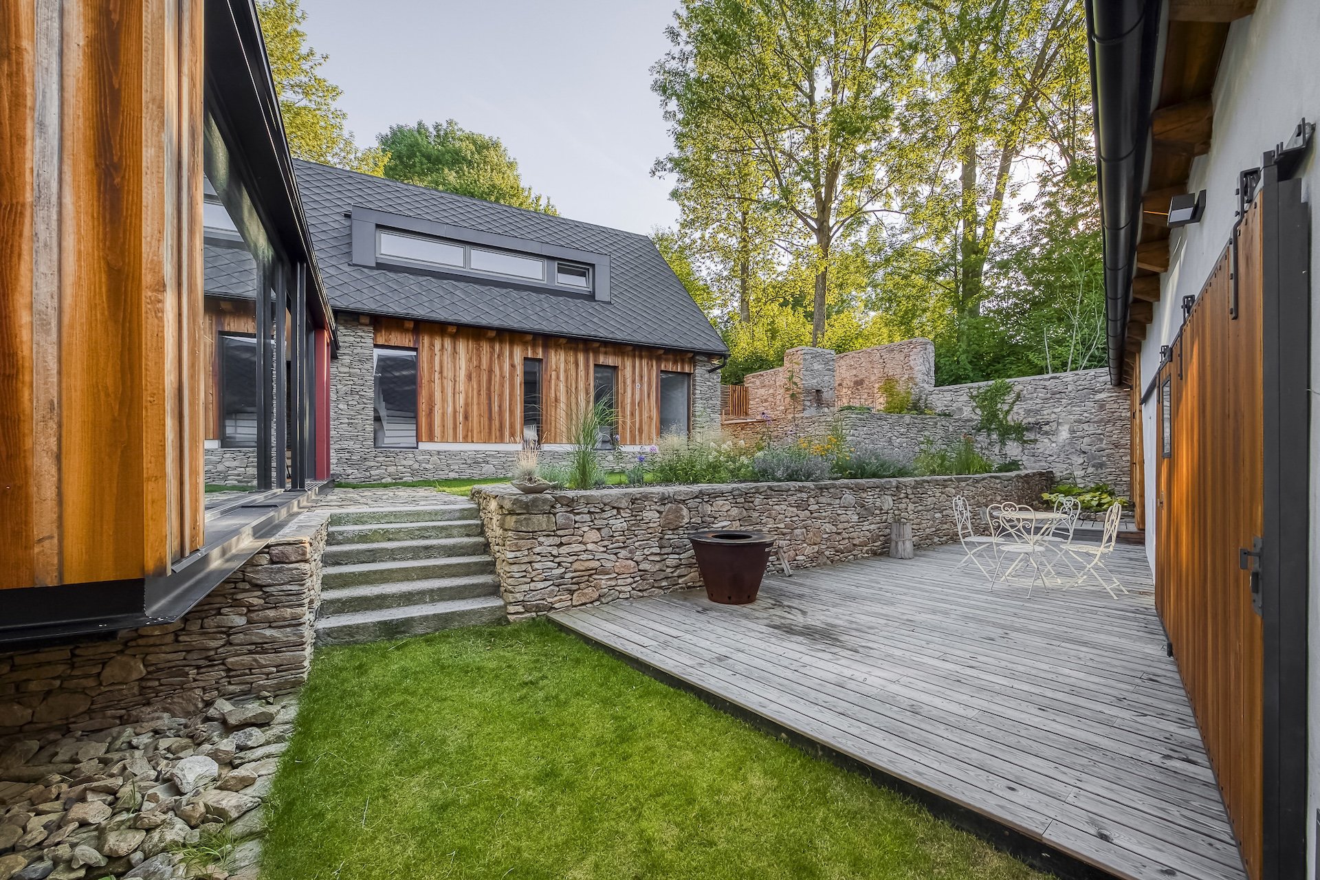 The second cottage captivates with its luxurious private wellness area, equipped with a Finnish sauna and whirlpool. A spacious relaxation room with stone cladding and large-format tiles opens directly onto a terrace with an outdoor lounge and plunge pool – an ideal setting for year-round relaxation. This part of the property also includes a technical room, cloakroom, and entrance hall with a stylish staircase leading upstairs, where two separate bedrooms share a large bathroom with toilet. Completing the estate is the original barn: its ground floor serves as a practical storage space and summer kitchen, while the upper level offers a generous open hall, perfectly suited for yoga sessions or intimate social gatherings.