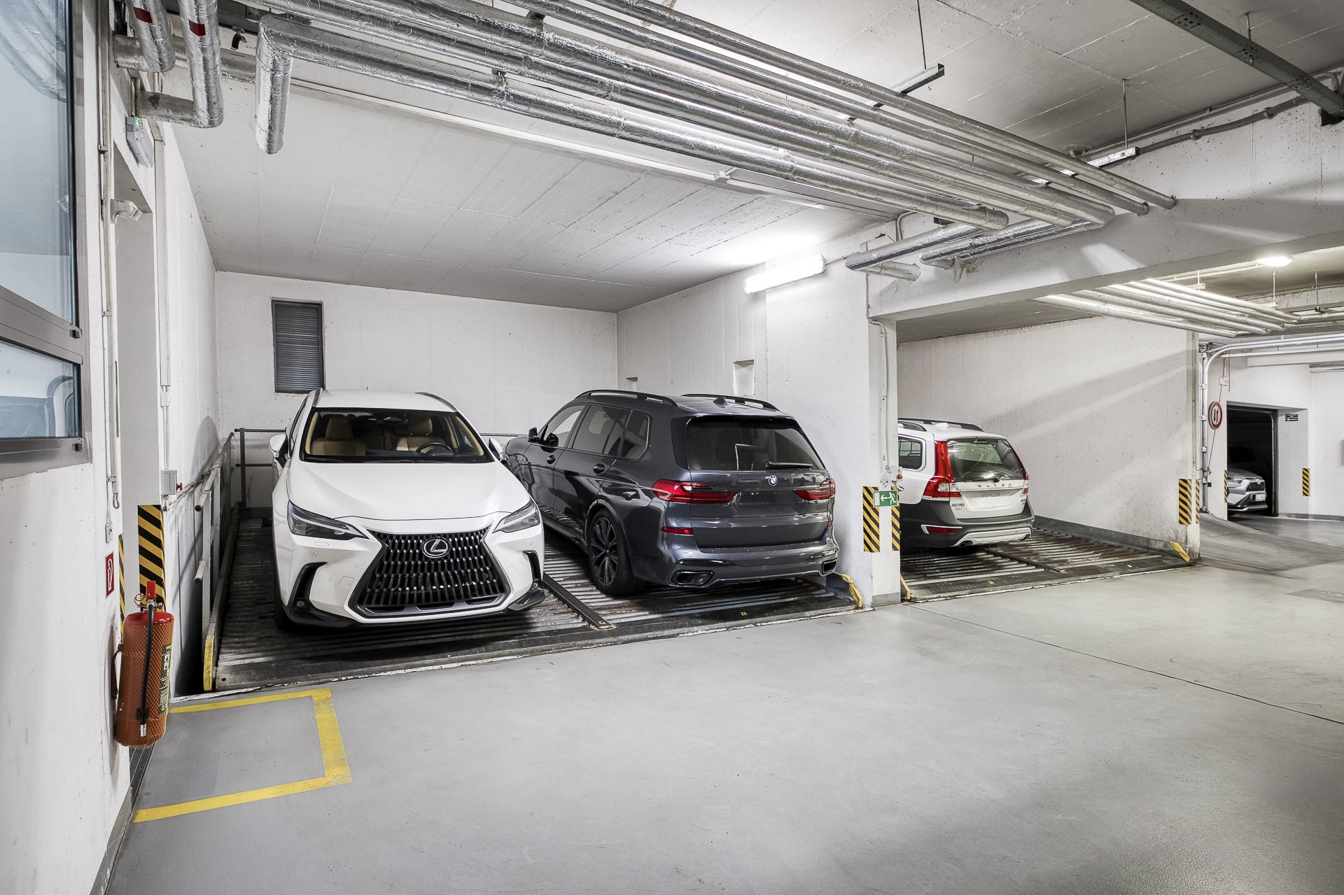 The high standard of equipment includes air conditioning, underfloor heating in the bathrooms, a smart home system, secure entrance doors, built-in wardrobes, and a fully equipped modern kitchen with appliances. Two cellars of 4 sqm, elevator access, and one garage parking space (with the option of renting an additional one) are also included. Service charges and utilities amount to approx. CZK 15,000 per month. The apartment will be available for occupancy from November 1, 2025.