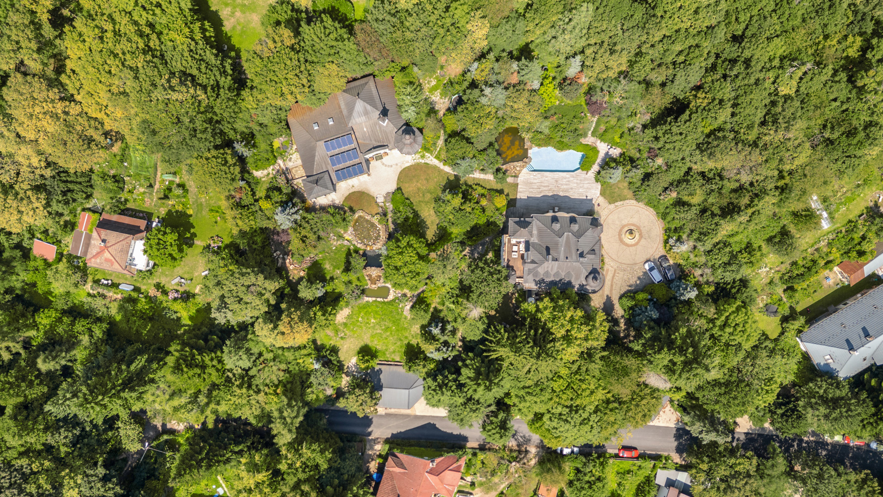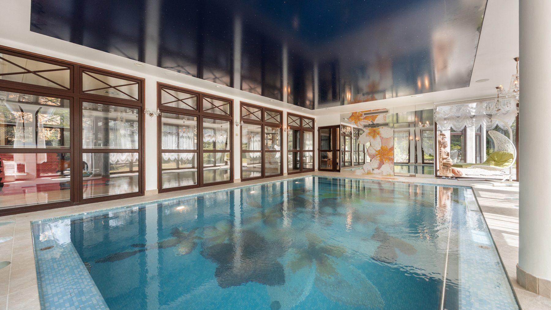 The plot includes a separate house with an area of 384 m², which serves as a flexible facility for social or private use: a conference room with a capacity for 40 people, a dance hall, an open bedroom with a bathroom, an indoor pool with a heat pump and a PGA Tour golf simulator. The building has its own solar panels and a separate heating system.