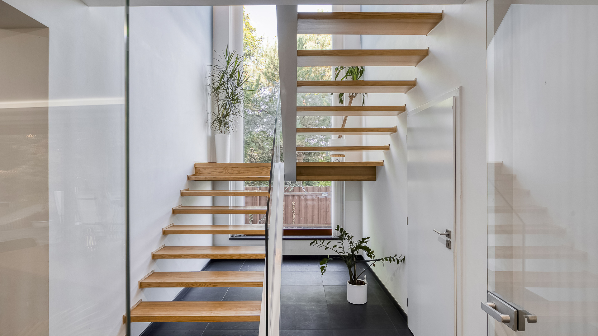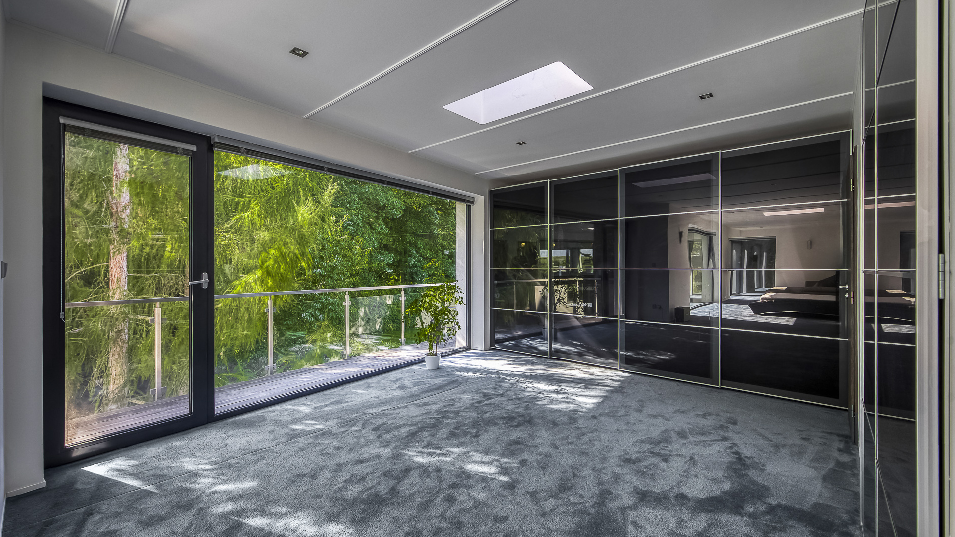 A stylish glass staircase leads to the middle floor, which contains most of the bedrooms. Here you will find one of the main bedrooms with an en-suite bathroom, a separate walk-in closet, and a balcony overlooking the garden. There are also two additional bedrooms, each with its own bathroom – one of them designed as a playful children’s room with hideaways. The top floor features the largest bedroom with a balcony once again facing the garden, along with a spacious home wellness area. This includes a twelve-meter swimming pool with counter-current, a steam shower, and a bathtub for several people, while a gas fireplace creates a cozy atmosphere for relaxation. The top floor can thus serve as a generous master suite with full facilities, yet the wellness area also has direct access from the corridor to ensure privacy if needed.