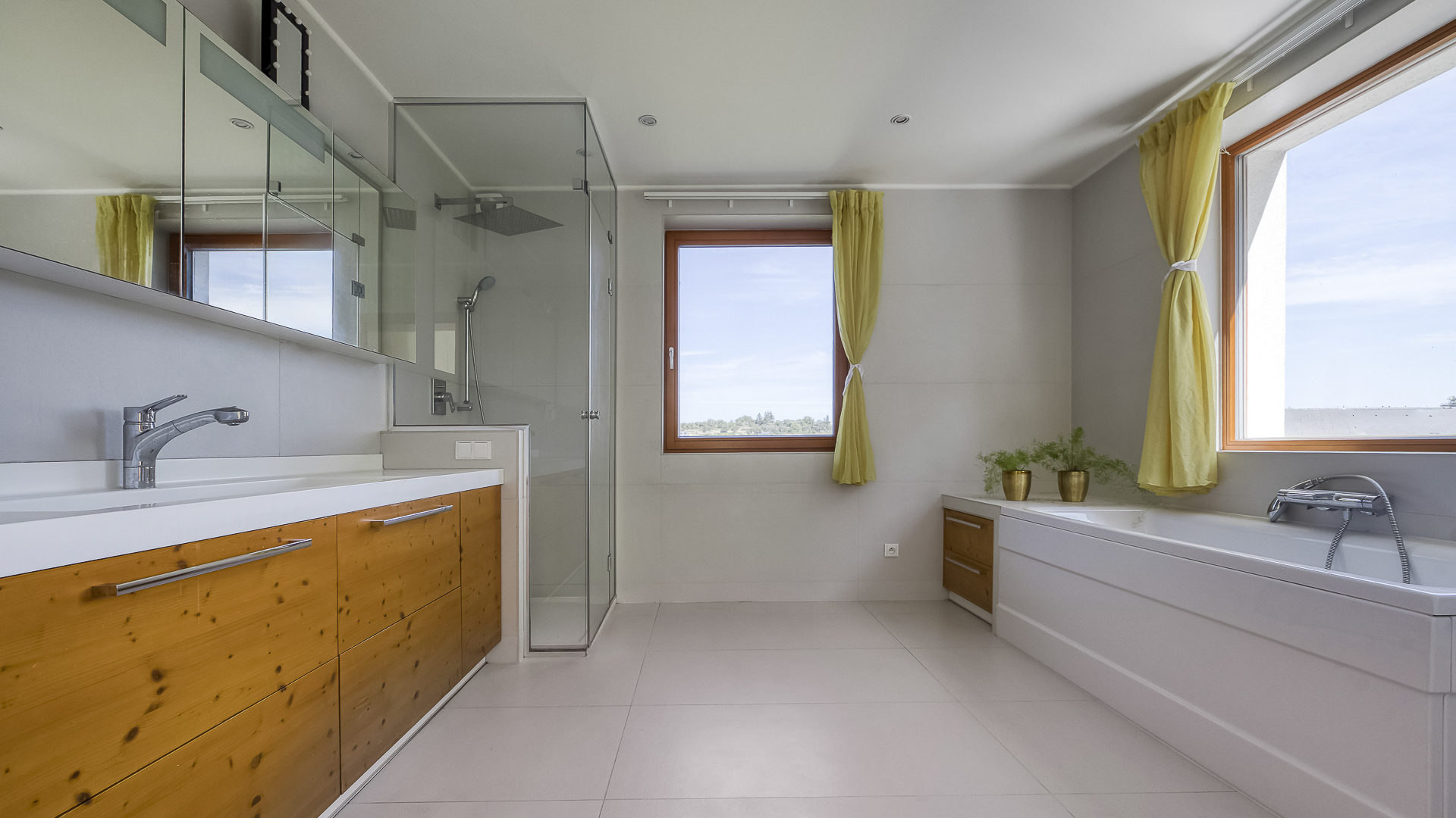 Czech Republic Sotheby’s International Realty offers for rent a modern family home located at the end of a cul-de-sac in Tuchoměřice. Thanks to its position on the very edge of the residential area, the property ensures exceptional privacy. The immediate proximity of nature, with a forest directly adjoining the plot, enhances the pleasant atmosphere of the spacious garden with a terrace and swimming pool. In addition to a maintained lawn, the garden also offers a touch of wilderness: thanks to the nearby forest you can find wild strawberries and mushrooms here, as well as mature trees including apple, plum, and peach. Premium materials were used in the construction of the house, naturally including large-format windows, underfloor heating, gas boilers, a heat pump, and a central vacuum system. A true highlight is the indoor swimming pool with counter-current, unusually located on the upper floor, providing panoramic views directly from the water.