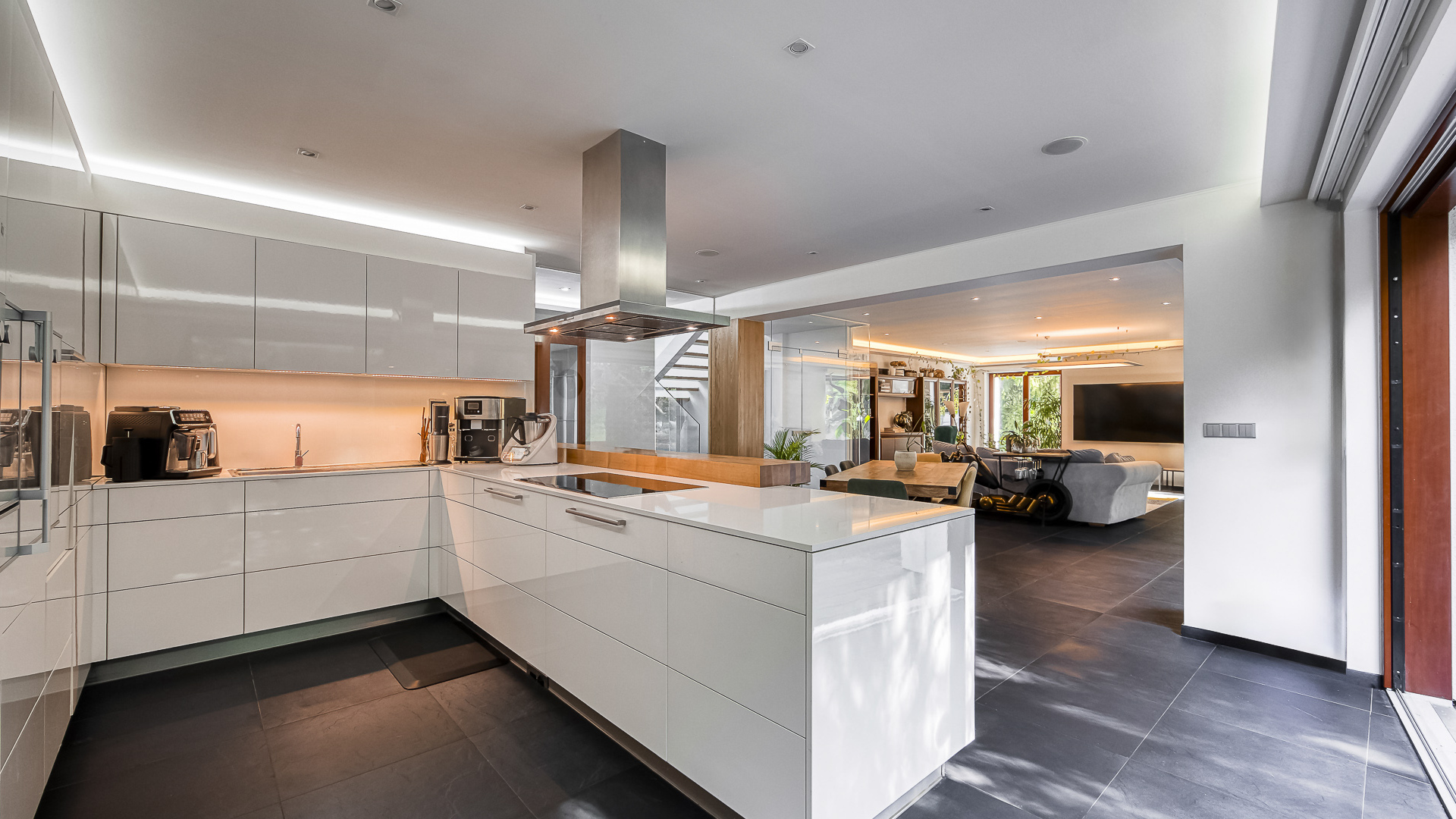 On the ground floor, there is a living room with a generously designed kitchen fitted with premium Gaggenau appliances and a dining area. From this space, large sliding doors lead to the adjoining outdoor terrace with a pool and barbecue facilities. The ground floor layout is further complemented by a guest room, entrance hall, main hallway, and bathroom with toilet. There is also a garage, beneath which is a cellar serving as a utility and storage area.